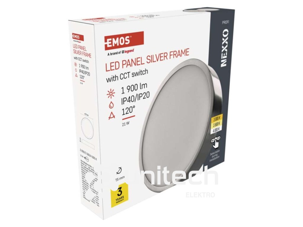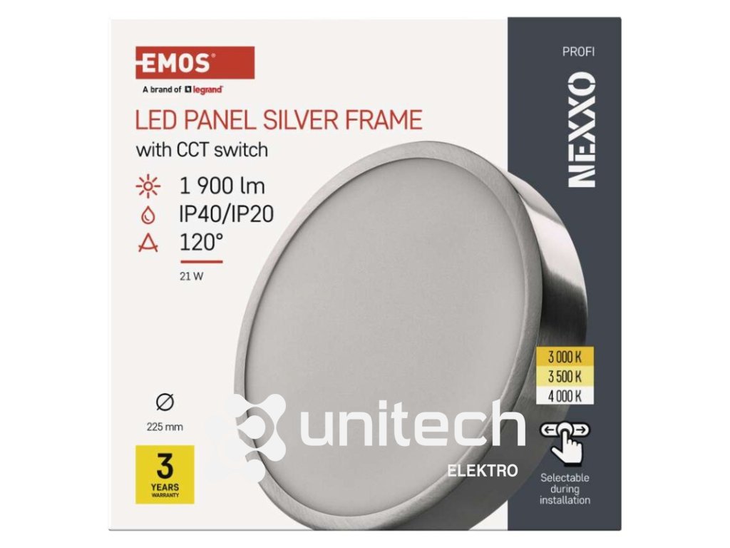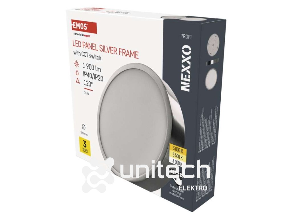 diaľkový ovládač: nie|do chodby a na schodisko: áno|do dielne a garáže: nie|do kancelárie: áno|do kuchyne: áno|do kúpeľne: nie|do obývačky, spálne a detskej izby: áno|dosah senzora: nemá senzor|do záhrady a na balkón: nie|farba svetla: teplá biela–neutrálna biela|farba tela: brúsený nikel|flicker-free: áno|frekvencia: 50/60 Hz|index podania farieb (CRI): Ra > 80|kategória: PROFI|krytie: IP40/IP20|materiál difúzora: plast (PMMA)|materiál LGP: PMMA|materiál tela: oceľový plech|montážny otvor: neuvádza sa|možnosť stmievania: nie|náhrada za žiarovku: 120 W|napätie: 220–240 V|pohybový senzor: nie|predajný obal: 1 ks, krabica|príkon: 21 W|prúd: 500 mA|rada: NEXXO|rozmer: priemer 225 × 42 mm|spôsob montáže: prisadené|svetelná účinnosť: 90 lm/W|svetelný tok: 1 900 lm|teplota chromatičnosti: 3 000/3 500/4 000 K|tvar: kruh|typ difúzora: mliečny|typ svietidla: klasické svietidlo|účinník: > 0,9|UGR<: neuvádza sa|uhol vyžarovania: 120°|umiestnenie: stropné/nástenné|výstupný prúd zo zdroja: neuvádza sa|záručná doba: 3 roky|zdroj svetla: LED|životnosť: 30 000 hodínDodatočné parametre