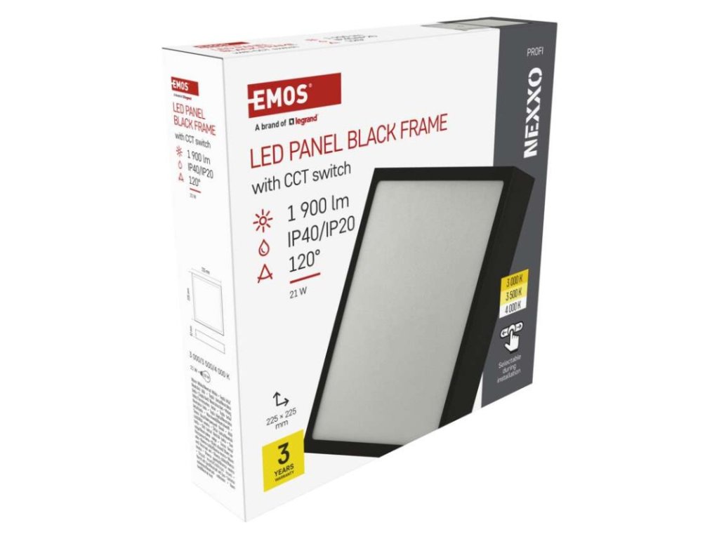 diaľkový ovládač: nie|do chodby a na schodisko: áno|do dielne a garáže: nie|do kancelárie: áno|do kuchyne: áno|do kúpeľne: nie|do obývačky, spálne a detskej izby: áno|dosah senzora: nemá senzor|do záhrady a na balkón: nie|farba svetla: teplá biela–neutrálna biela|farba tela: čierna|flicker-free: áno|frekvencia: 50/60 Hz|index podania farieb (CRI): Ra > 80|kategória: PROFI|krytie: IP40/IP20|materiál difúzora: plast (PMMA)|materiál LGP: PMMA|materiál tela: oceľový plech|montážny otvor: neuvádza sa|možnosť stmievania: nie|náhrada za žiarovku: 120 W|napätie: 220–240 V|pohybový senzor: nie|predajný obal: 1 ks, krabica|príkon: 21 W|prúd: 500 mA|rada: NEXXO|rozmer: 225 × 225 × 42 mm|spôsob montáže: prisadené|svetelná účinnosť: 90 lm/W|svetelný tok: 1 900 lm|teplota chromatičnosti: 3 000/3 500/4 000 K|tvar: štvorec|typ difúzora: mliečny|typ svietidla: klasické svietidlo|účinník: > 0,9|UGR<: neuvádza sa|uhol vyžarovania: 120°|umiestnenie: stropné/nástenné|výstupný prúd zo zdroja: neuvádza sa|záručná doba: 3 roky|zdroj svetla: LED|životnosť: 30 000 hodínDodatočné parametre