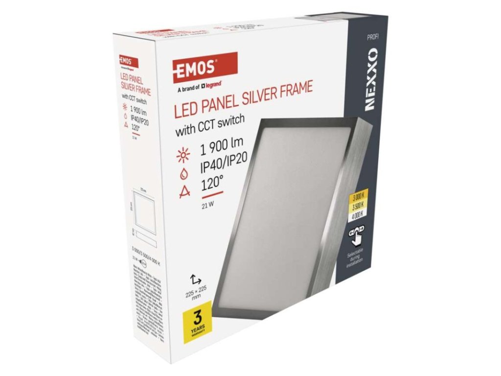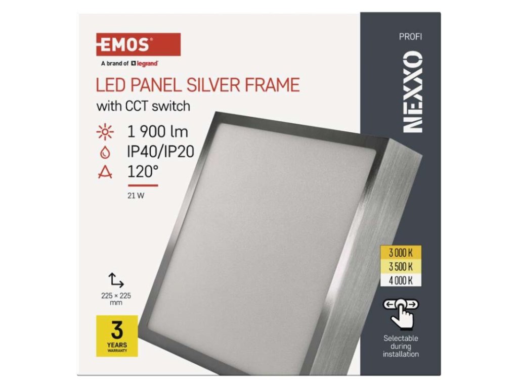 diaľkový ovládač: nie|do chodby a na schodisko: áno|do dielne a garáže: nie|do kancelárie: áno|do kuchyne: áno|do kúpeľne: nie|do obývačky, spálne a detskej izby: áno|dosah senzora: nemá senzor|do záhrady a na balkón: nie|farba svetla: teplá biela–neutrálna biela|farba tela: brúsený nikel|flicker-free: áno|frekvencia: 50/60 Hz|index podania farieb (CRI): Ra > 80|kategória: PROFI|krytie: IP40/IP20|materiál difúzora: plast (PMMA)|materiál LGP: PMMA|materiál tela: oceľový plech|montážny otvor: neuvádza sa|možnosť stmievania: nie|náhrada za žiarovku: 120 W|napätie: 220–240 V|pohybový senzor: nie|predajný obal: 1 ks, krabica|príkon: 21 W|prúd: 500 mA|rada: NEXXO|rozmer: 225 × 225 × 42 mm|spôsob montáže: prisadené|svetelná účinnosť: 90 lm/W|svetelný tok: 1 900 lm|teplota chromatičnosti: 3 000/3 500/4 000 K|tvar: štvorec|typ difúzora: mliečny|typ svietidla: klasické svietidlo|účinník: > 0,9|UGR<: neuvádza sa|uhol vyžarovania: 120°|umiestnenie: stropné/nástenné|výstupný prúd zo zdroja: neuvádza sa|záručná doba: 3 roky|zdroj svetla: LED|životnosť: 30 000 hodínDodatočné parametre