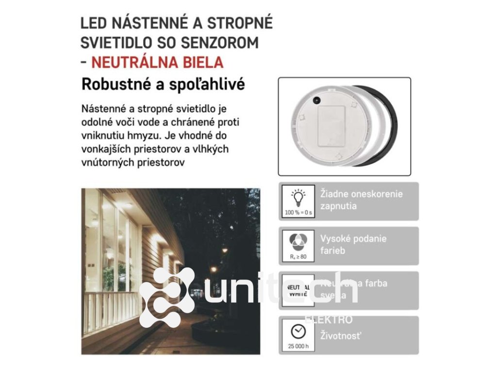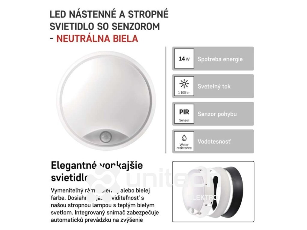 diaľkový ovládač: nie|do chodby a na schodisko: áno|do dielne a garáže: áno|do kancelárie: nie|do kuchyne: nie|do kúpeľne: áno|do obývačky, spálne a detskej izby: nie|dosah senzora: 10 m|do záhrady a na balkón: áno|farba svetla: neutrálna biela|farba tela: čierna/biela|flicker-free: áno|frekvencia: 50/60 Hz|index podania farieb (CRI): Ra > 80|kategória: CLASSIC|krytie: IP54|materiál difúzora: plast (PC)|materiál LGP: neuvádza sa|materiál tela: plast (PC)|montážny otvor: neuvádza sa|možnosť stmievania: nie|náhrada za žiarovku: 75 W|napätie: 220–240 V|pohybový senzor: PIR|predajný obal: 1 ks, krabica|príkon: 14 W|prúd: 120 mA|rada: ZURI|rozmer: priemer 215 × 80 mm|spôsob montáže: prisadené|svetelná účinnosť: 71 lm/W|svetelný tok: 1 100 lm|teplota chromatičnosti: 4 000 K|tvar: kruh|typ difúzora: mliečny|typ svietidla: klasické svietidlo|účinník: > 0,5|UGR<: neuvádza sa|uhol vyžarovania: 120°|umiestnenie: nástenné|výstupný prúd zo zdroja: neuvádza sa|záručná doba: 2 roky|zdroj svetla: LED|životnosť: 25 000 hodínDodatočné parametre