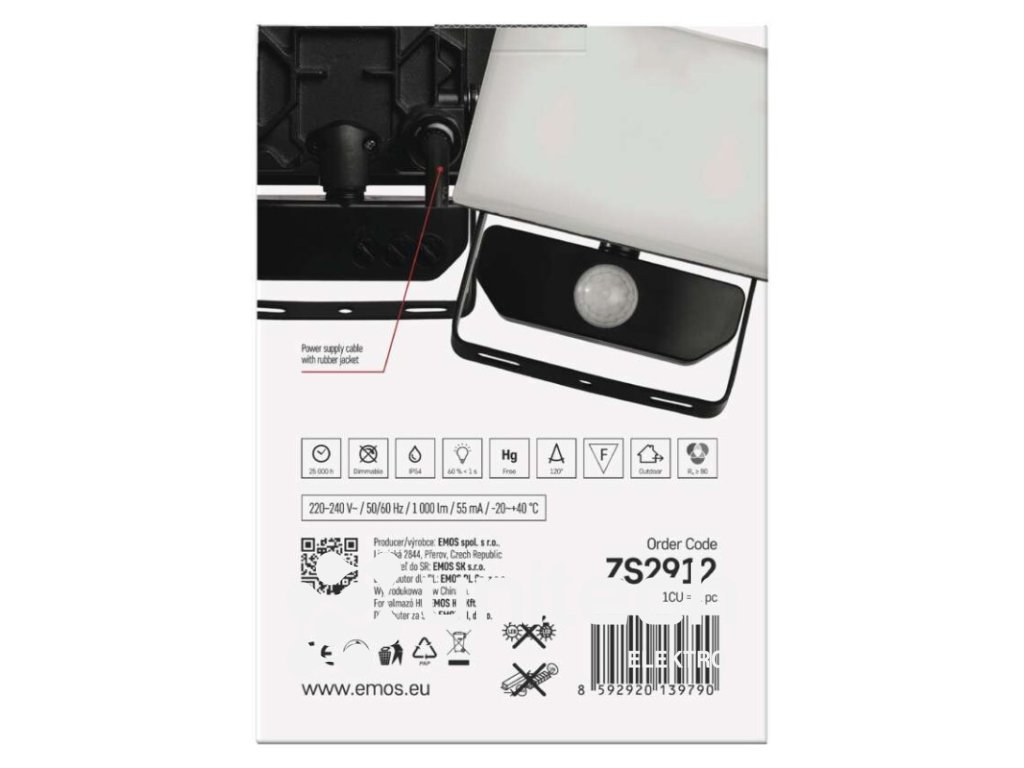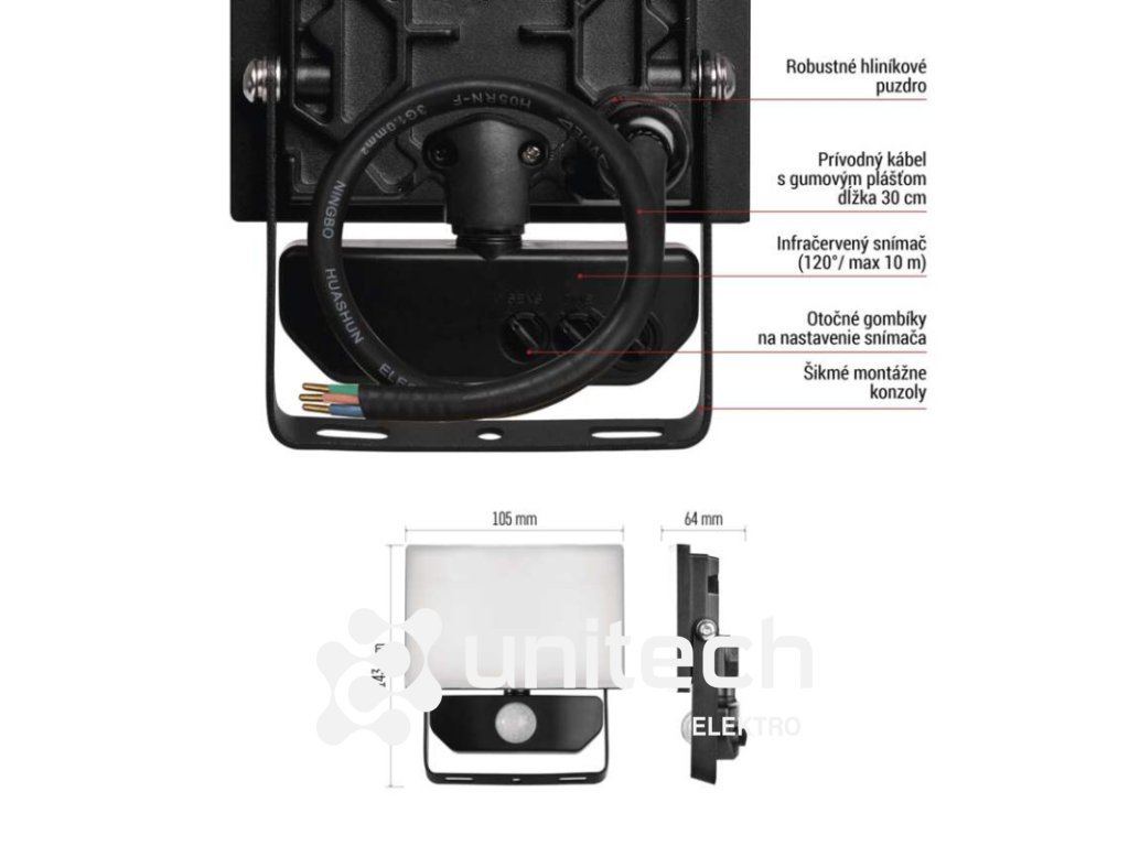 akumulátor: neuvádza sa|dĺžka prívodného kábla: 30 cm|doba svietenia na AKU: neuvádza sa|dosah PIR senzora: 10 m|energetická trieda použitého zdroja svetla: –|farba: čierna|farba svetla: neutrálna biela|flicker-free: áno|frekvencia: 50/60 Hz|index podania farieb (CRI): Ra > 80|kategória: CLASSIC|krytie: IP54|materiál difúzora: plast (PC)|materiál prívodného kábla: guma|materiál tela: hliník|napájanie: zo siete|napätie: 220–240 V~|PIR senzor: áno|počet priechodných zásuviek: 0|použitie: povrchová montáž|predajný obal: 1 ks, krabica|príkon: 10 W|prúd: 55 mA|rada: TAMBO|rozmer: 105 × 143 × 64 mm|rozsah pracovnej teploty: -20 °C až +40 °C|skúšobná žiarovka súčasťou balenia: nie|stmievanie: nie|stupeň ochrany proti mechanickým nárazom: IK06|svetelná účinnosť: 100 lm/W|svetelný tok: 1 000 lm|teplota chromatičnosti: 4 000 K|typ priechodných zásuviek: neuvádza sa|typ prívodného kábla: neuvádza sa|typ stmievania: –|účinník: > 0,9|uhol vyžarovania: 120°|záručná doba: 3 roky|zdroj svetla: LED|životnosť: 25 000 hodínDodatočné parametre