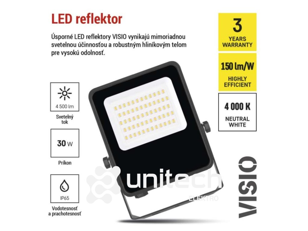 akumulátor: nie|dĺžka prívodného kábla: 25 cm|doba svietenia na AKU: #|dosah PIR senzora: nemá PIR|energetická trieda použitého zdroja svetla: –|farba: čierna|farba svetla: neutrálna biela|flicker-free: áno|frekvencia: 50/60 Hz|index podania farieb (CRI): Ra > 80|kategória: CLASSIC|krytie: IP65|materiál difúzora: sklo|materiál prívodného kábla: guma|materiál tela: hliník|napájanie: zo siete|napätie: 220–240 V~|PIR senzor: nie|počet priechodných zásuviek: #|použitie: povrchová montáž|predajný obal: 1 ks, krabica|príkon: 30 W|prúd: 135 mA|rada: VISIO|rozmer: 163 × 135 × 22 mm|rozsah pracovnej teploty: -20 °C až +40 °C|skúšobná žiarovka súčasťou balenia: nie|stmievanie: nie|stupeň ochrany proti mechanickým nárazom: IK06|svetelná účinnosť: #|svetelný tok: 4 500 lm|teplota chromatičnosti: 4 000 K|typ priechodných zásuviek: #|typ prívodného kábla: H05RN-F|typ stmievania: –|účinník: > 0,9|uhol vyžarovania: 110°|záručná doba: 3 roky|zdroj svetla: LED|životnosť: 36 000 hodinDodatočné parametre