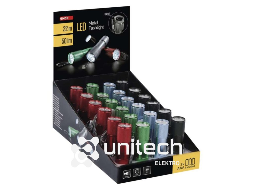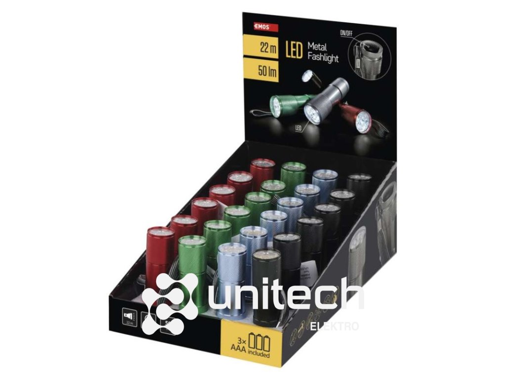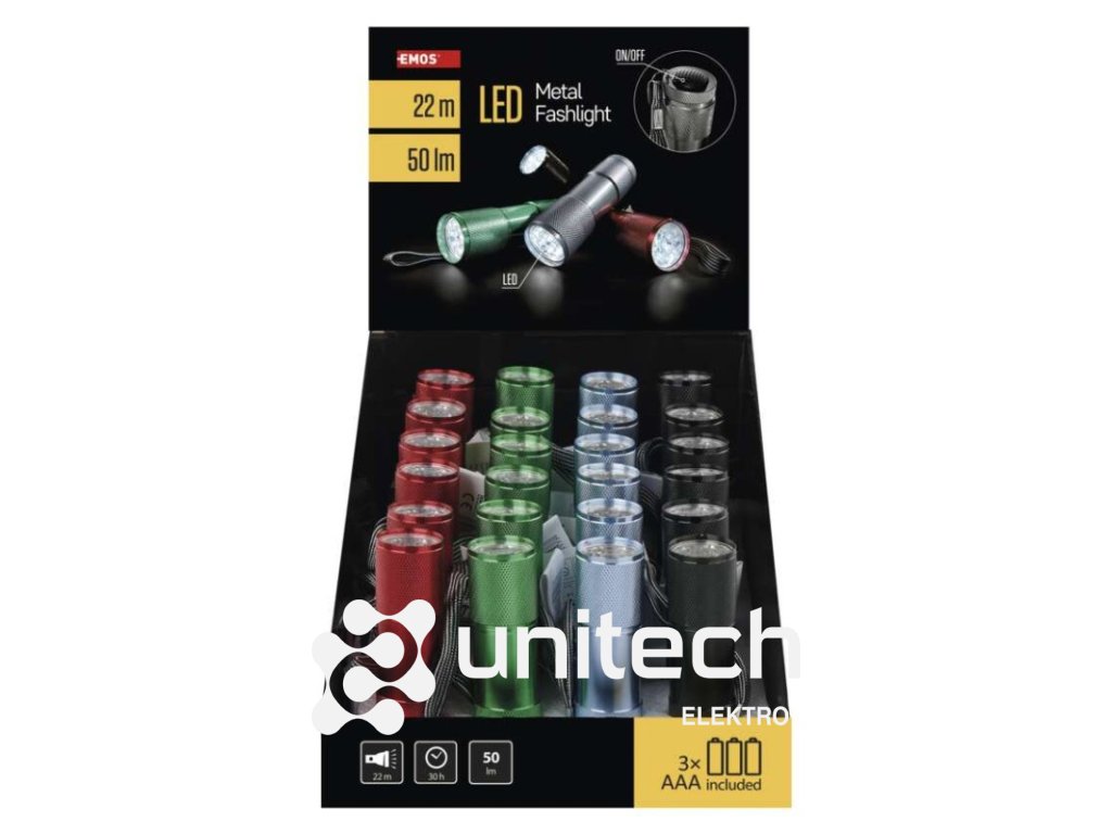 batérie súčasťou balenia: áno|doba nabíjania: neuvádza sa|doba svietenia: 30 h|doba svietenia detail: LED 100 % – 30 h|dosvit: LED 100 % – 22 m|farba: mix farieb|fokus: nie|hmotnosť: 71 g|LED indikácia nabíjania: neuvádza sa|LED indikácia stavu akumulátora: neuvádza sa|materiál: hliník|maximálny dosvit: 22 m|maximálny svetelný tok: 50 lm|nabíjací: nie|napájanie: 3× AAA|nárazuvzdornosť: áno|počet režimov svietenia: 1|predajný obal: 24 ks, display box|príslušenstvo: neuvádza sa|režimy: LED 100 %|rozmer: 88 × 26 × 26 mm|špeciálna funkcia: neuvádza sa|svetelný tok: LED 100 % – 50 lm|typ batérie: LR03 (1,5 V)|typ napájacieho konektoru: neuvádza sa|vodeodolná: neuvádza sa|vybavenie: neuvádza sa|záručná doba: 2 roky|zdroj svetla: 9× LED|značka: EMOSDodatočné parametre