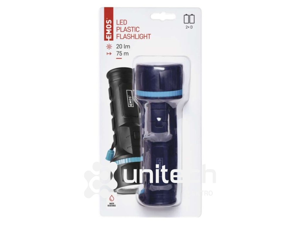 batérie súčasťou balenia: nie|doba nabíjania: neuvádza sa|doba svietenia: 140 h|doba svietenia detail: neuvádza sa|dosvit: LED 100 % – 75 m|farba: čierno-modrá|fokus: nie|hmotnosť: 216 g|LED indikácia nabíjania: neuvádza sa|LED indikácia stavu akumulátora: neuvádza sa|materiál: plast + guma|maximálny dosvit: 75 m|maximálny svetelný tok: 20 lm|nabíjací: nie|napájanie: 2× D|nárazuvzdornosť: nie|počet režimov svietenia: 1|predajný obal: 1 ks, papierový blister|príslušenstvo: neuvádza sa|režimy: LED 100 %|rozmer: 190 × 68 × 68 mm|špeciálna funkcia: neuvádza sa|svetelný tok: LED 100 % – 20 lm|typ batérie: LR20 (1,5 V)|typ napájacieho konektoru: neuvádza sa|vodeodolná: áno (IP43)|vybavenie: pútko|záručná doba: 2 roky|zdroj svetla: LED|značka: EMOSDodatočné parametre