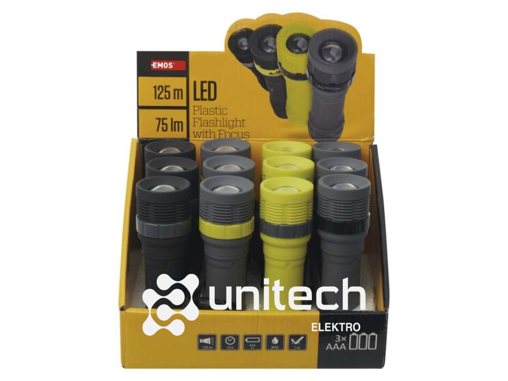 batérie súčasťou balenia: áno|doba nabíjania: neuvádza sa|doba svietenia: 15 h|doba svietenia detail: LED 100 % – 15 h|dosvit: 125 m (max. zoom), 45 m (min. zoom)|farba: žltá - sivý krúžok; sivá - žltý krúžok; čierna - sivý krúžok; sivá - čierny krúžok|fokus: áno|hmotnosť: 83 g|LED indikácia nabíjania: neuvádza sa|LED indikácia stavu akumulátora: neuvádza sa|materiál: ABS plast|maximálny dosvit: 125 m|maximálny svetelný tok: 75 lm|nabíjací: nie|napájanie: 3× AAA|nárazuvzdornosť: áno|počet režimov svietenia: 1|predajný obal: 12 ks, display box|príslušenstvo: neuvádza sa|režimy: LED 100 %|rozmer: 120 × 35 × 35 mm|špeciálna funkcia: neuvádza sa|svetelný tok: LED 100 % – 75 lm|typ batérie: LR03 (1,5 V)|typ napájacieho konektoru: neuvádza sa|vodeodolná: áno (IP43)|vybavenie: pútko|záručná doba: 2 roky|zdroj svetla: LED|značka: EMOSDodatočné parametre