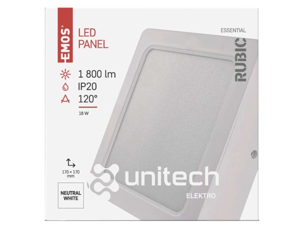 diaľkový ovládač: nie|do chodby a na schodisko: áno|do dielne a garáže: áno|do kancelárie: nie|do kuchyne: áno|do kúpeľne: nie|do obývačky, spálne a detskej izby: nie|dosah senzora: nemá senzor|do záhrady a na balkón: nie|farba svetla: neutrálna biela|farba tela: biela|flicker-free: áno|frekvencia: 50/60 Hz|index podania farieb (CRI): Ra > 80|kategória: ESSENTIAL|krytie: IP20|materiál difúzora: plast (PC)|materiál LGP: neuvádza sa|materiál tela: plast (PC)|montážny otvor: neuvádza sa|možnosť stmievania: nie|náhrada za žiarovku: 110 W|napätie: 220–240 V|pohybový senzor: nie|predajný obal: 1 ks, krabica|príkon: 18 W|prúd: 157 mA|rada: RUBIC|rozmer: 170 × 170 × 42 mm|spôsob montáže: prisadené|svetelná účinnosť: 100 lm/W|svetelný tok: 1 800 lm|teplota chromatičnosti: 4 000 K|tvar: štvorec|typ difúzora: mliečny|typ svietidla: klasické svietidlo|účinník: > 0,7|UGR<: neuvádza sa|uhol vyžarovania: 120°|umiestnenie: stropné/nástenné|výstupný prúd zo zdroja: 50 mA|záručná doba: 2 roky|zdroj svetla: LED|životnosť: 25 000 hodínDodatočné parametre