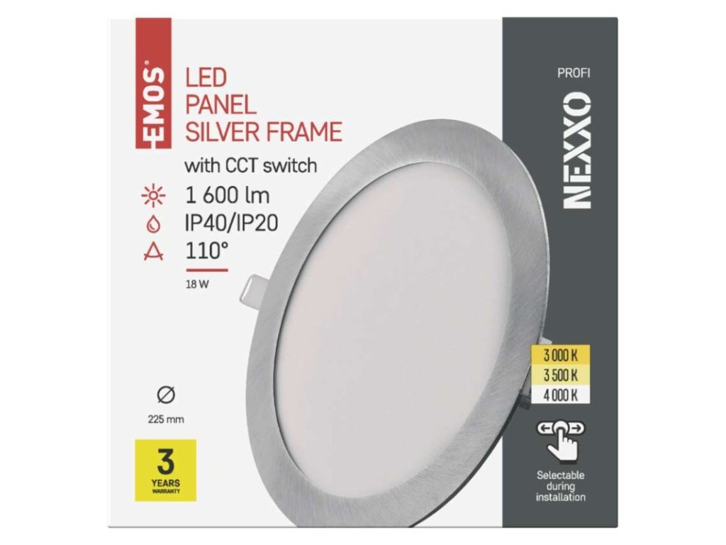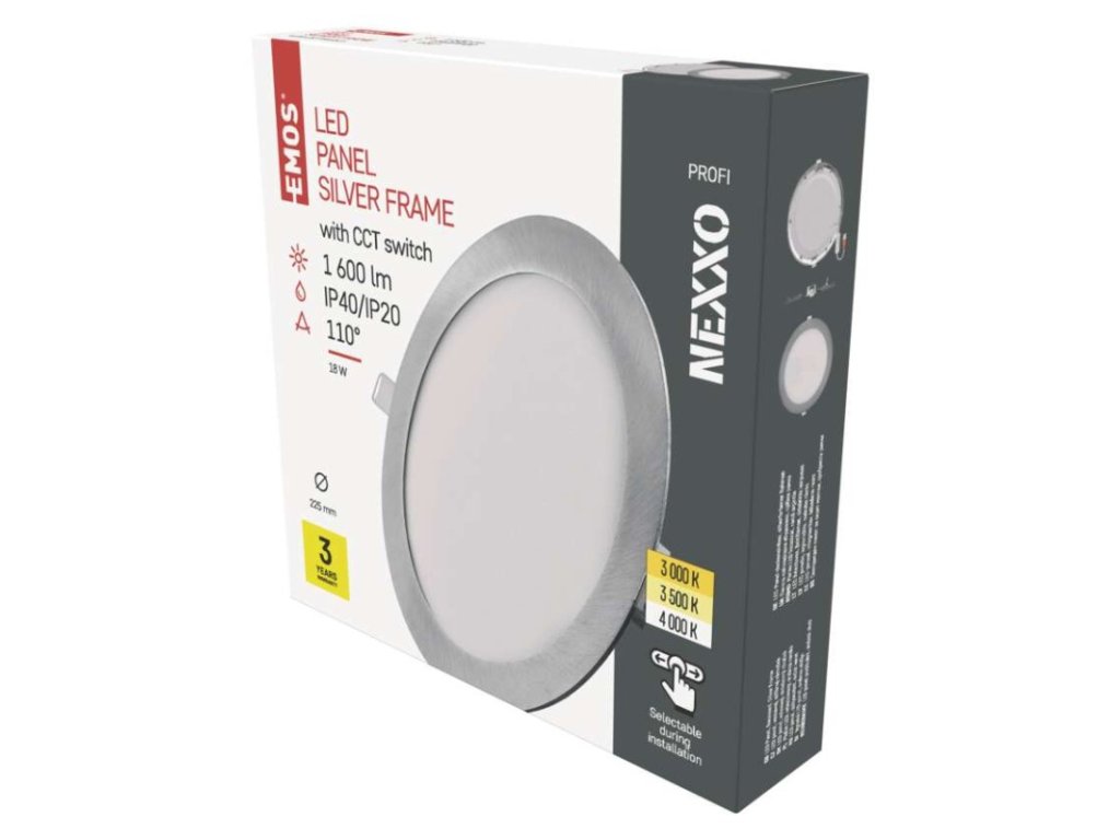 diaľkový ovládač: nie|do chodby a na schodisko: áno|do dielne a garáže: nie|do kancelárie: áno|do kuchyne: áno|do kúpeľne: nie|do obývačky, spálne a detskej izby: áno|dosah senzora: nemá senzor|do záhrady a na balkón: nie|farba svetla: teplá biela–neutrálna biela|farba tela: brúsený nikel|flicker-free: áno|frekvencia: 50/60 Hz|index podania farieb (CRI): Ra > 82|kategória: PROFI|krytie: IP40/IP20|materiál difúzora: plast (PS)|materiál LGP: PMMA|materiál tela: hliník|montážny otvor: 205 mm|možnosť stmievania: nie|náhrada za žiarovku: 100 W|napätie: 220–240 V|pohybový senzor: nie|predajný obal: 1 ks, krabica|príkon: 18 W|prúd: 84 mA|rada: NEXXO|rozmer: priemer 225 × 21 mm|spôsob montáže: vstavané|svetelná účinnosť: 83 lm/W|svetelný tok: 1 600 lm|teplota chromatičnosti: 3 000/3 500/4 000 K|tvar: kruh|typ difúzora: mliečny|typ svietidla: klasické svietidlo|účinník: > 0,9|UGR<: neuvádza sa|uhol vyžarovania: 110°|umiestnenie: stropné|výstupný prúd zo zdroja: 300 mA|záručná doba: 3 roky|zdroj svetla: LED|životnosť: 30 000 hodínDodatočné parametre