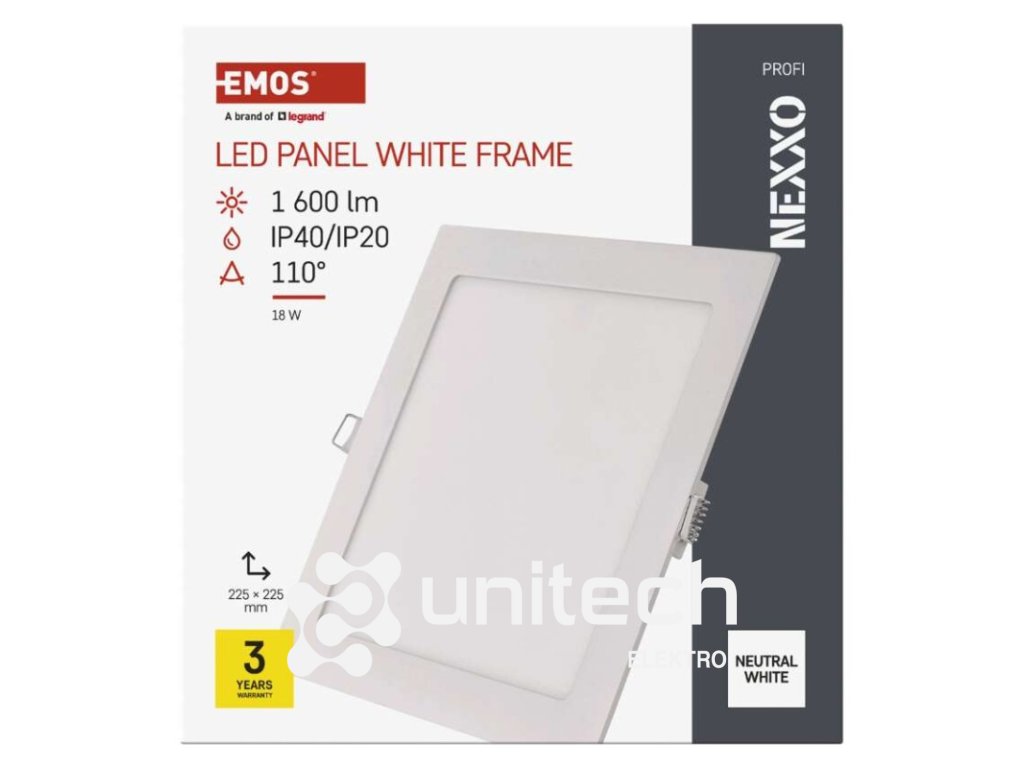 diaľkový ovládač: nie|do chodby a na schodisko: áno|do dielne a garáže: nie|do kancelárie: áno|do kuchyne: áno|do kúpeľne: nie|do obývačky, spálne a detskej izby: áno|dosah senzora: nemá senzor|do záhrady a na balkón: nie|farba svetla: neutrálna biela|farba tela: biela|flicker-free: áno|frekvencia: 50/60 Hz|index podania farieb (CRI): Ra > 82|kategória: PROFI|krytie: IP40/IP20|materiál difúzora: plast (PS)|materiál LGP: PMMA|materiál tela: hliník|montážny otvor: 205 × 205 mm|možnosť stmievania: nie|náhrada za žiarovku: 100 W|napätie: 220–240 V|pohybový senzor: nie|predajný obal: 1 ks, krabica|príkon: 18 W|prúd: 84 mA|rada: NEXXO|rozmer: 225 × 225 × 21 mm|spôsob montáže: vstavané|svetelná účinnosť: 83 lm/W|svetelný tok: 1 600 lm|teplota chromatičnosti: 4 000 K|tvar: štvorec|typ difúzora: mliečny|typ svietidla: klasické svietidlo|účinník: > 0,9|UGR<: neuvádza sa|uhol vyžarovania: 110°|umiestnenie: stropné|výstupný prúd zo zdroja: 300 mA|záručná doba: 3 roky|zdroj svetla: LED|životnosť: 30 000 hodínDodatočné parametre