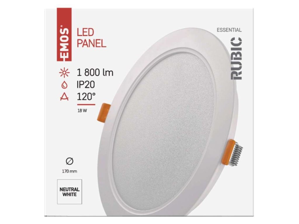 diaľkový ovládač: nie|do chodby a na schodisko: áno|do dielne a garáže: nie|do kancelárie: nie|do kuchyne: áno|do kúpeľne: nie|do obývačky, spálne a detskej izby: nie|dosah senzora: nemá senzor|do záhrady a na balkón: nie|farba svetla: neutrálna biela|farba tela: biela|flicker-free: áno|frekvencia: 50/60 Hz|index podania farieb (CRI): Ra > 80|kategória: ESSENTIAL|krytie: IP20|materiál difúzora: plast (PC)|materiál LGP: neuvádza sa|materiál tela: plast (PC)|montážny otvor: 140–160 mm|možnosť stmievania: nie|náhrada za žiarovku: 110 W|napätie: 220–240 V|pohybový senzor: nie|predajný obal: 1 ks, krabica|príkon: 18 W|prúd: 157 mA|rada: RUBIC|rozmer: priemer 170 × 26 mm|spôsob montáže: vstavané|svetelná účinnosť: 100 lm/W|svetelný tok: 1 800 lm|teplota chromatičnosti: 4 000 K|tvar: kruh|typ difúzora: mliečny|typ svietidla: klasické svietidlo|účinník: > 0,7|UGR<: neuvádza sa|uhol vyžarovania: 120°|umiestnenie: stropné|výstupný prúd zo zdroja: 50 mA|záručná doba: 2 roky|zdroj svetla: LED|životnosť: 25 000 hodínDodatočné parametre