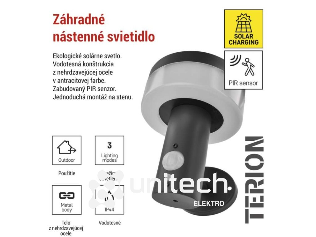 energetická trieda použitého zdroja svetla: –|farba: antracit|farba svetla: Teplá biela|fotovoltaický článok: 0,88 W|frekvencia: –|index podania farieb (CRI): > 80|kategória: CLASSIC|krytie: IP44|materiál: nehrdzavejúca oceľ|materiál difúzora: plast|napájanie: Li-Ion batéria 3,7 V/1 200 mAh|napätie: –|pätica (uchytenie žiarovky): –|predajný obal: 1 ks, krabička|príkon: 2 W|rada: TERION|rozmer: 147 × 125 × 146 mm|rozsah pracovnej teploty: 0 ~ +40 °C|Rozsah snímača PIR: 10 m|senzor PIR: áno|súmrakový spínač: áno|svetelný tok: max. 200 lm|teplota chromatičnosti: 3000 K|vstavaný vypínač: áno|zdroj svetla: LED|žiarovka súčasťou balenia: –|životnosť: 25 000 hDodatočné parametre