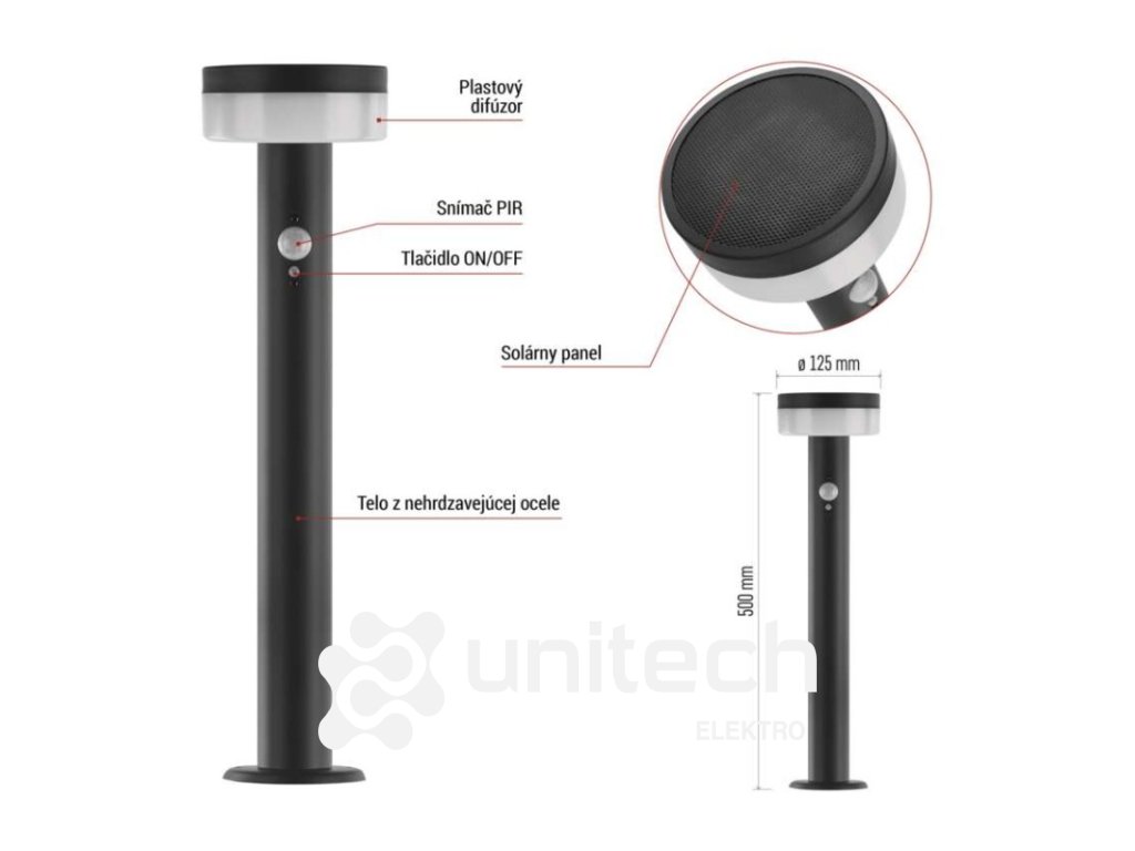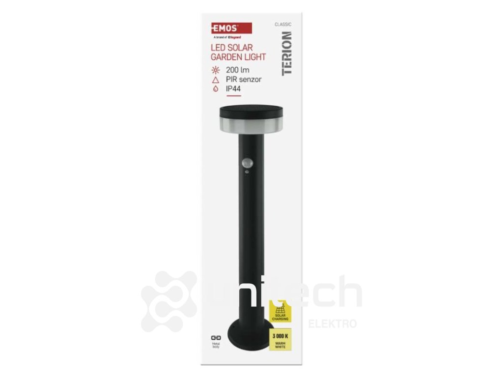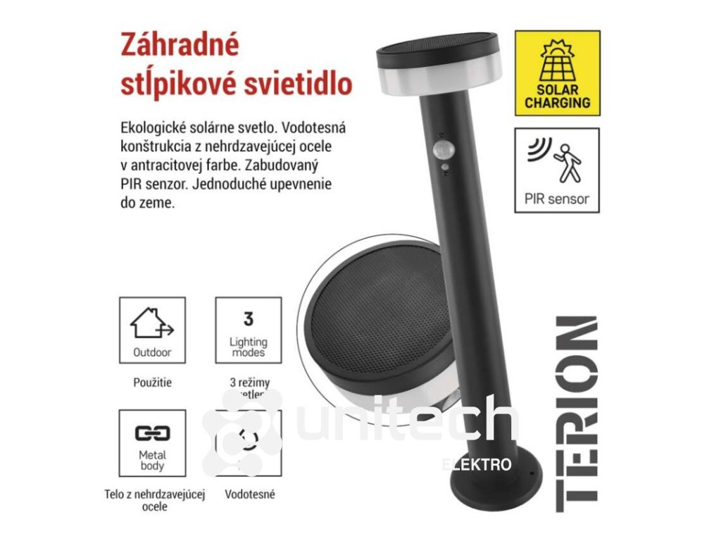 energetická trieda použitého zdroja svetla: –|farba: antracit|farba svetla: Teplá biela|fotovoltaický článok: 0,88 W|frekvencia: –|index podania farieb (CRI): > 80|kategória: CLASSIC|krytie: IP44|materiál: nehrdzavejúca oceľ|materiál difúzora: plast|napájanie: Li-Ion batéria 3,7 V/1 200 mAh|napätie: –|pätica (uchytenie žiarovky): –|predajný obal: 1 ks, krabička|príkon: 2 W|rada: TERION|rozmer: 125 × 125 × 500 mm|rozsah pracovnej teploty: 0 ~ +40 °C|Rozsah snímača PIR: 10 m|senzor PIR: áno|súmrakový spínač: áno|svetelný tok: max. 200 lm|teplota chromatičnosti: 3000 K|vstavaný vypínač: áno|zdroj svetla: LED|žiarovka súčasťou balenia: –|životnosť: 25 000 hDodatočné parametre