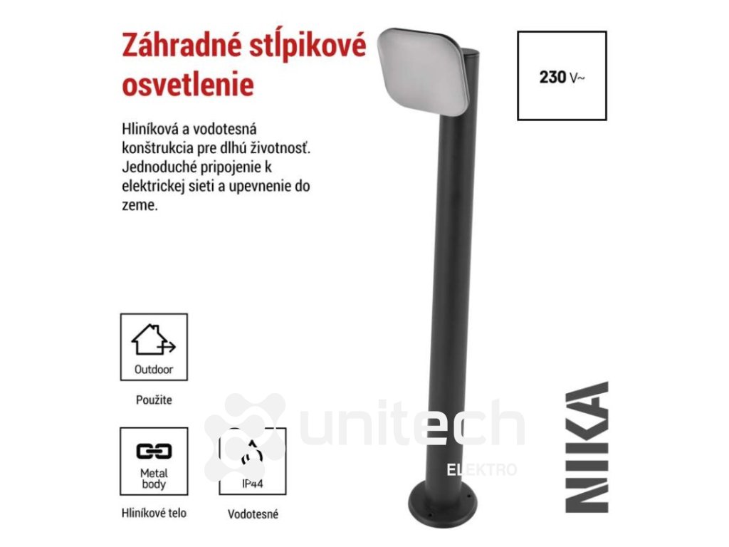 energetická trieda použitého zdroja svetla: G|farba: antracit|farba svetla: Teplá biela|fotovoltaický článok: nie|frekvencia: 50/60 Hz|index podania farieb (CRI): > 80|kategória: CLASSIC|krytie: IP44|materiál: hliník|materiál difúzora: plast|napájanie: 230 V AC|napätie: 220-240 V~|pätica (uchytenie žiarovky): –|predajný obal: 1 ks, krabička|príkon: 12,5 W|rada: NIKA|rozmer: 120 × 120 × 800 mm|rozsah pracovnej teploty: -20 ~ +40 °C|Rozsah snímača PIR: –|senzor PIR: Nie|súmrakový spínač: nie|svetelný tok: 900 lm|teplota chromatičnosti: 3000 K|vstavaný vypínač: nie|zdroj svetla: LED|žiarovka súčasťou balenia: –|životnosť: 25 000 hDodatočné parametre