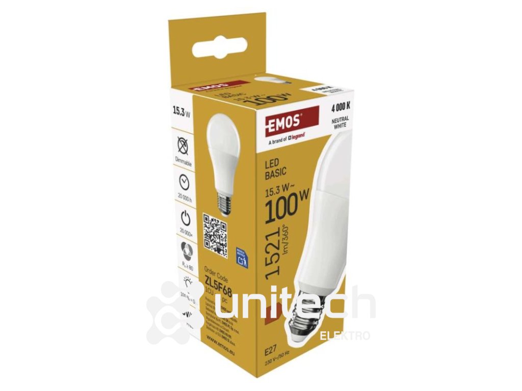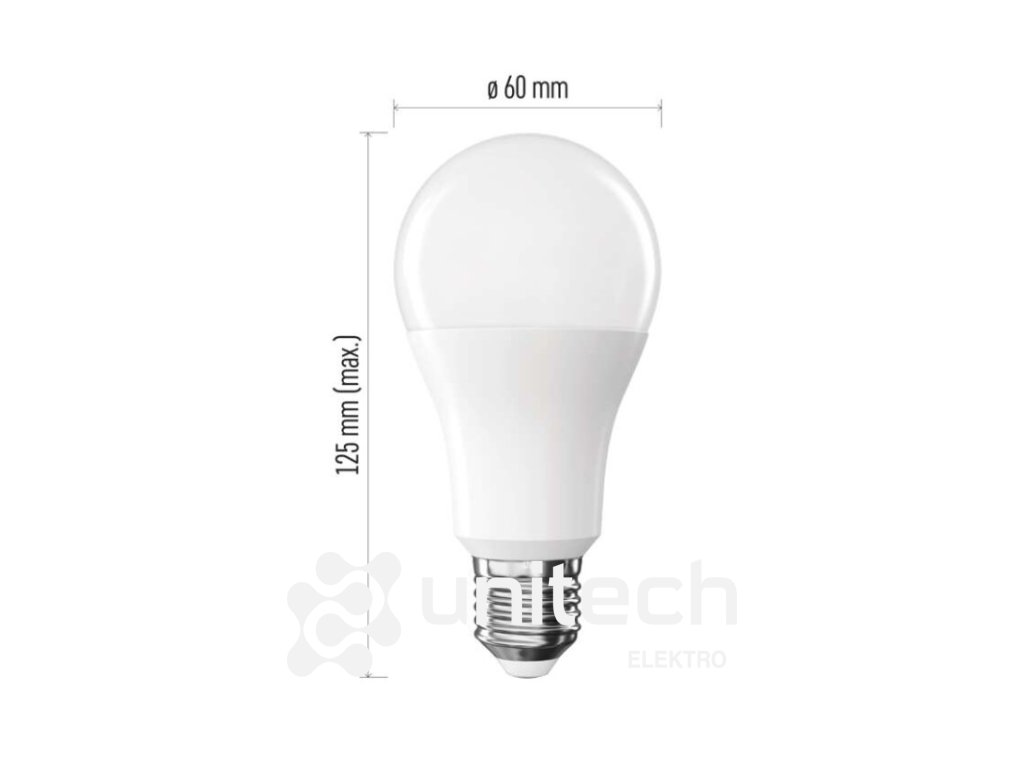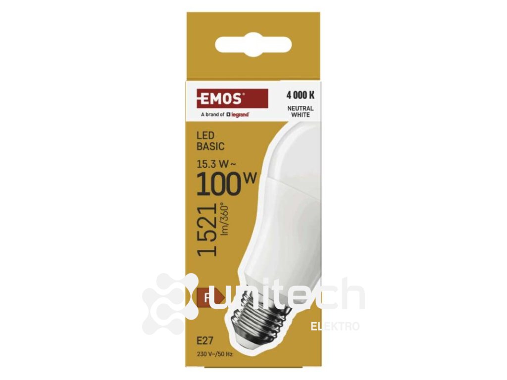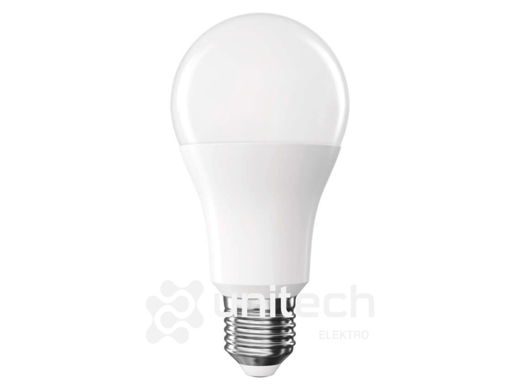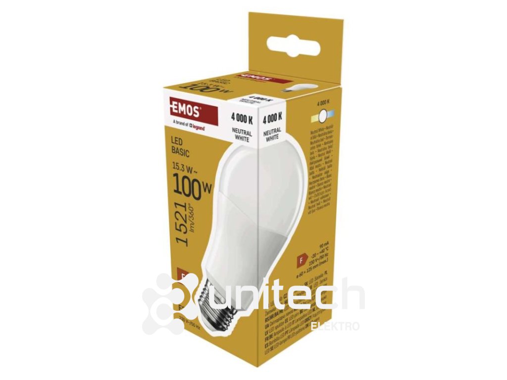 energetická trieda: F|farba svetla: neutrálna biela|index podania farieb (CRI): Ra >80|kompatibilita: –|náhrada za žiarovku: 100 W|napätie: 230 V~/50 Hz|notifikácie do mobilnej aplikácie: nie|ovládanie hlasovými asistentmi: nie|pätica (uchytenie žiarovky): E27|počet čipov: neuvádza sa|počet spínacích cyklov: 20 000|podporované OS: –|predajný obal: 1 ks, krabička|prenosová frekvencia: –|príkon: 15,3 W|protokol: –|rada: BASIC|rozmer: #|stmievateľná: nie|svetelná účinnosť: 99 lm/W|svetelný tok: 1 521 lm|technológia: LED|teplota chromatičnosti: 4 000 K|tvar: A60|typ čipov: SMD|účinník: 0.50|uhol vyžarovania: 200°|záručná doba: 2 roky|životnosť: 20 000 hodínDodatočné parametre