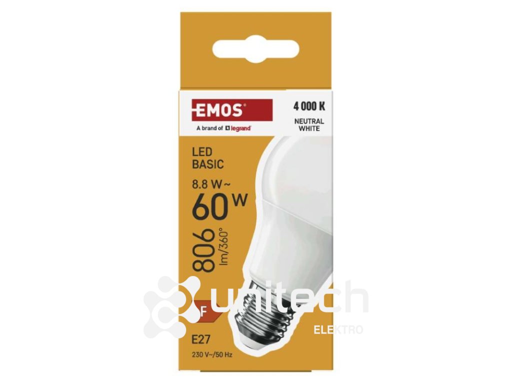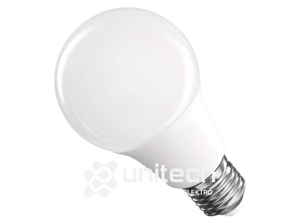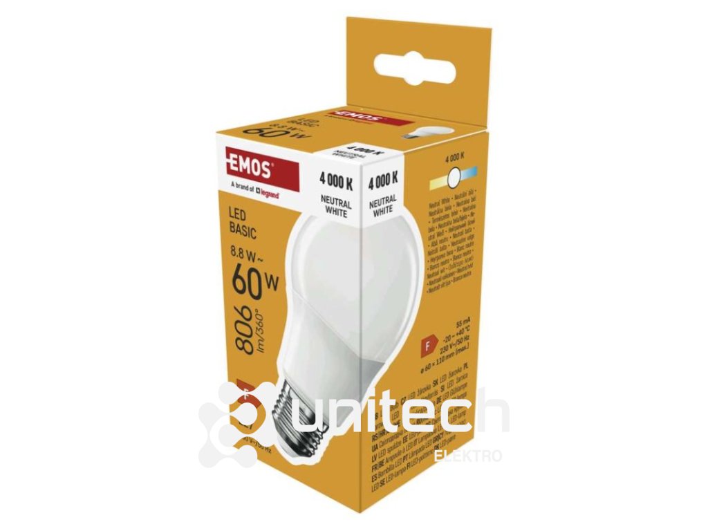 energetická trieda: F|farba svetla: neutrálna biela|index podania farieb (CRI): Ra >80|kompatibilita: –|náhrada za žiarovku: 60 W|napätie: 230 V~/50 Hz|notifikácie do mobilnej aplikácie: nie|ovládanie hlasovými asistentmi: nie|pätica (uchytenie žiarovky): E27|počet čipov: neuvádza sa|počet spínacích cyklov: 20 000|podporované OS: –|predajný obal: 1 ks, krabička|prenosová frekvencia: –|príkon: 8,8 W|protokol: –|rada: BASIC|rozmer: 60 × 60 × 110 (max.) mm|stmievateľná: nie|svetelná účinnosť: 92 lm/W|svetelný tok: 806 lm|technológia: LED|teplota chromatičnosti: 4 000 K|tvar: A60|typ čipov: SMD|účinník: 0.50|uhol vyžarovania: 200°|záručná doba: 2 roky|životnosť: 20 000 hodínDodatočné parametre