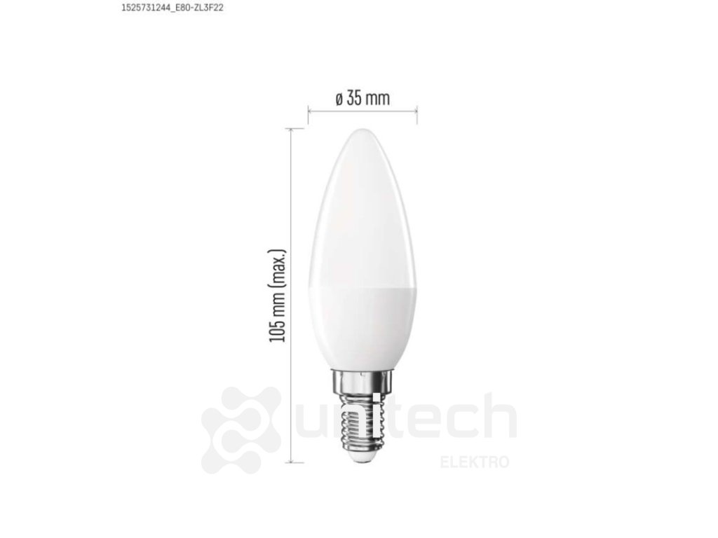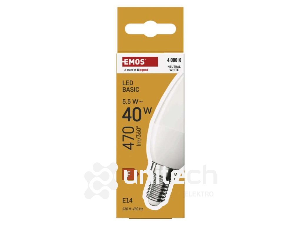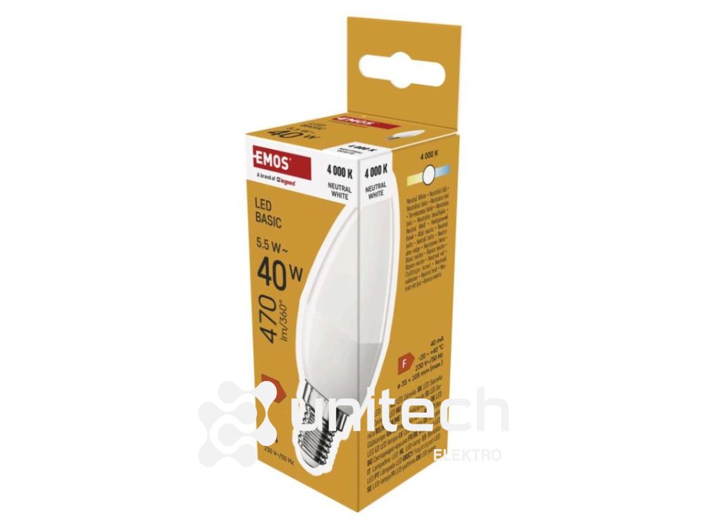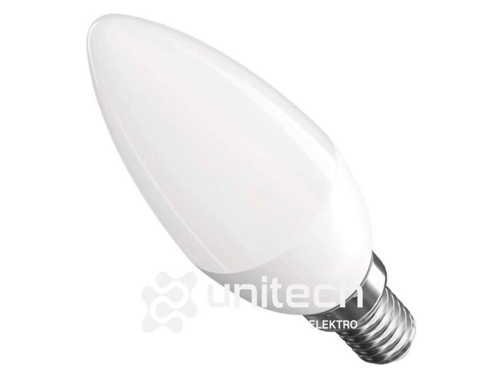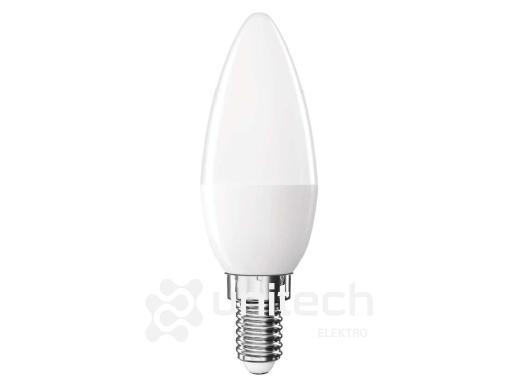 energetická trieda: F|farba svetla: neutrálna biela|index podania farieb (CRI): Ra >80|kompatibilita: neuvádza sa|náhrada za žiarovku: 40 W|napätie: 230 V~/50 Hz|notifikácie do mobilnej aplikácie: neuvádza sa|ovládanie hlasovými asistentmi: neuvádza sa|pätica (uchytenie žiarovky): E14|počet čipov: neuvádza sa|počet spínacích cyklov: 20 000|podporované OS: neuvádza sa|predajný obal: 1 ks, krabička|prenosová frekvencia: neuvádza sa|príkon: 5,5 W|protokol: neuvádza sa|rada: BASIC|rozmer: 35 × 35 × 110 mm|stmievateľná: nie|svetelná účinnosť: 85 lm/W|svetelný tok: 470 lm|technológia: LED|teplota chromatičnosti: 4 000 K|tvar: sviečka|typ čipov: SMD|účinník: 0.50|uhol vyžarovania: 180°|záručná doba: 2 roky|životnosť: 20 000 hodínDodatočné parametre