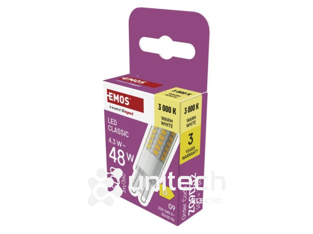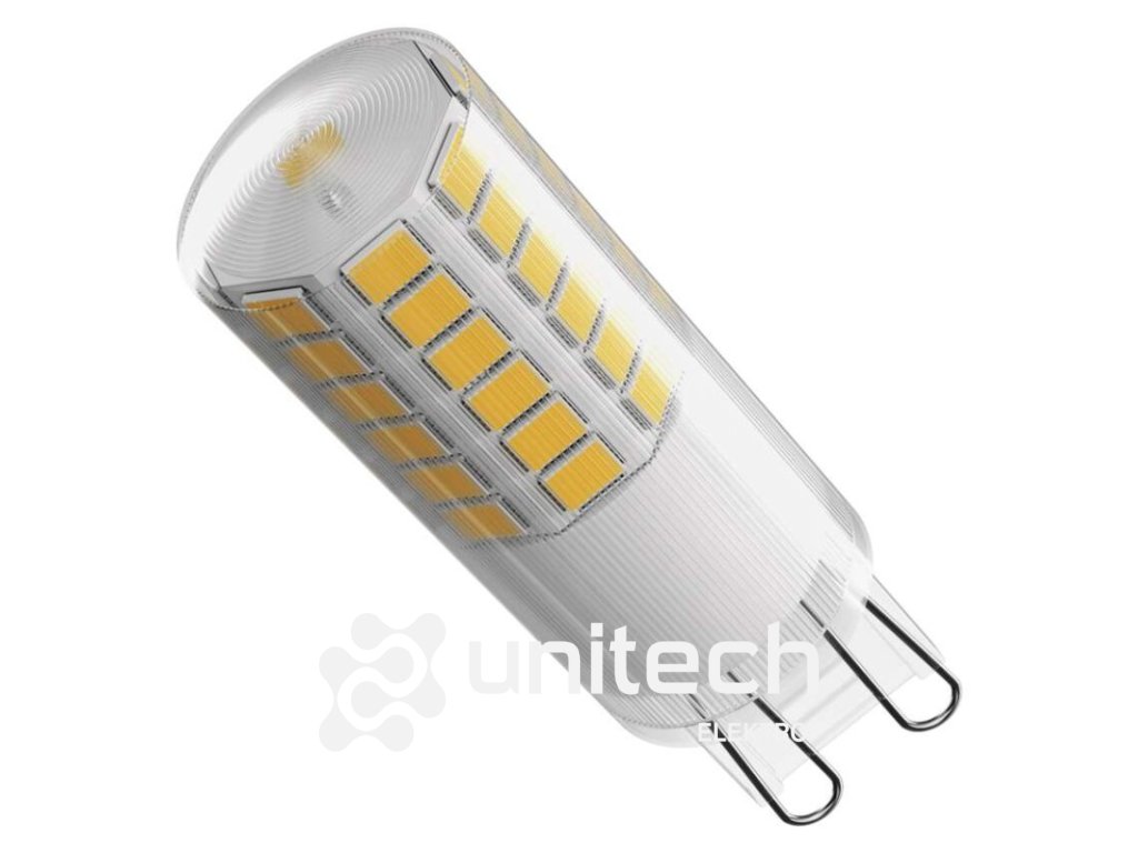 energetická trieda: D|farba svetla: teplá biela|frekvencia: 50/60 Hz|index podania farieb (CRI): Ra >80|kompatibilita: –|náhrada za žiarovku: 48 W|napätie: 220-240 V~|notifikácie do mobilnej aplikácie: –|ovládanie hlasovými asistentmi: –|pätica (uchytenie žiarovky): G9|počet čipov: –|počet spínacích cyklov: 25 000|podporované OS: –|predajný obal: 1 ks, krabička|prenosová frekvencia: –|príkon: 4,3 W|protokol: –|rada: CLASSIC|rozmer: 18 × 18 × 60 mm|stmievateľná: nie|svetelná účinnosť: 140 lm/W|svetelný tok: 600 lm|technológia: LED|teplota chromatičnosti: 3 000 K|tvar: JC|typ čipov: SMD|účinník: 0,40|uhol vyžarovania: 300°|záručná doba: 3 roky|životnosť: 30 000 hodínDodatočné parametre
