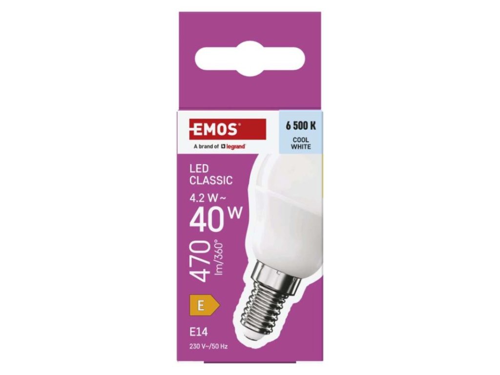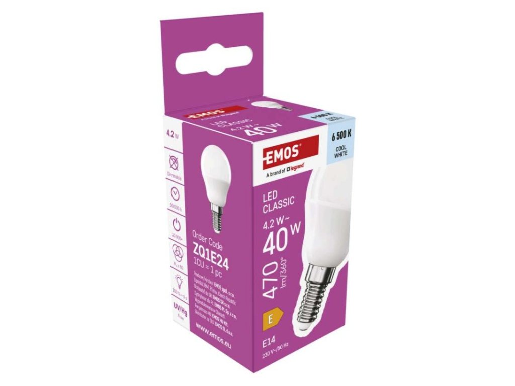 energetická trieda: E|farba svetla: studená biela|index podania farieb (CRI): Ra >80|kompatibilita: –|náhrada za žiarovku: 40 W|napätie: 230 V~/50 Hz|notifikácie do mobilnej aplikácie: nie|ovládanie hlasovými asistentmi: nie|pätica (uchytenie žiarovky): E14|počet čipov: neuvádza sa|počet spínacích cyklov: 30 000|podporované OS: –|predajný obal: 1 ks, krabička|prenosová frekvencia: –|príkon: 4,2 W|protokol: –|rada: CLASSIC|rozmer: 45 × 45 × 82 mm|stmievateľná: nie|svetelná účinnosť: 112 lm/W|svetelný tok: 470 lm|technológia: LED|teplota chromatičnosti: 6 500 K|tvar: Mini Globe|typ čipov: SMD|účinník: 0.50|uhol vyžarovania: 150°|záručná doba: 3 roky|životnosť: 30 000 hodínDodatočné parametre