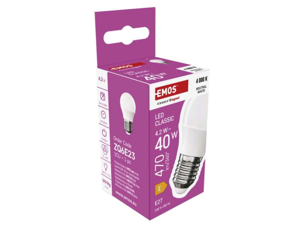 energetická trieda: E|farba svetla: neutrálna biela|index podania farieb (CRI): Ra >80|kompatibilita: –|náhrada za žiarovku: 40 W|napätie: 230 V~/50 Hz|notifikácie do mobilnej aplikácie: nie|ovládanie hlasovými asistentmi: nie|pätica (uchytenie žiarovky): E27|počet čipov: neuvádza sa|počet spínacích cyklov: 30 000|podporované OS: –|predajný obal: 1 ks, krabička|prenosová frekvencia: –|príkon: 4,2 W|protokol: –|rada: CLASSIC|rozmer: 45 × 45 × 77 mm|stmievateľná: nie|svetelná účinnosť: 112 lm/W|svetelný tok: 470 lm|technológia: LED|teplota chromatičnosti: 4 000 K|tvar: Mini Globe|typ čipov: SMD|účinník: 0.50|uhol vyžarovania: 150°|záručná doba: 3 roky|životnosť: 30 000 hodínDodatočné parametre