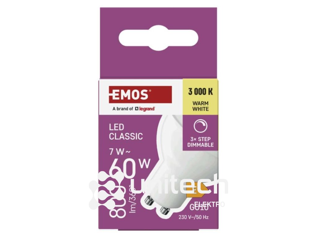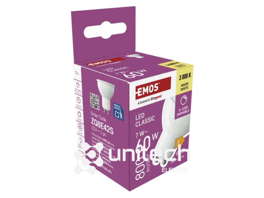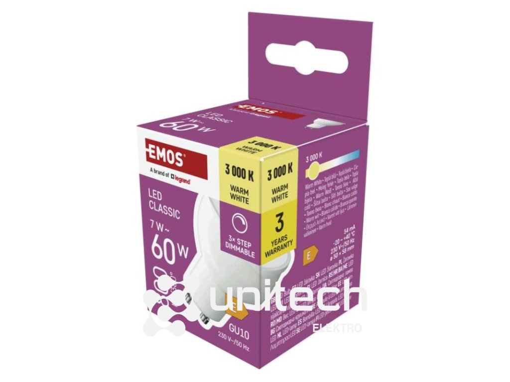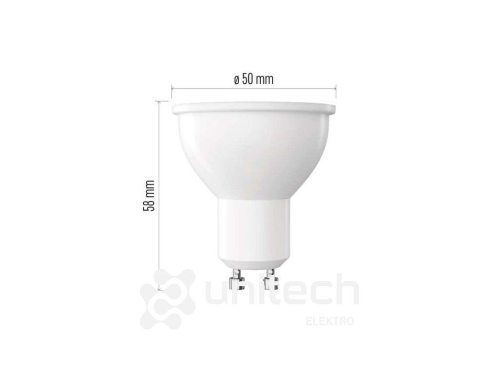energetická trieda: E|farba svetla: teplá biela|index podania farieb (CRI): Ra >80|kompatibilita: neuvádza sa|náhrada za žiarovku: 60 W|napätie: 230 V~/50 Hz|notifikácie do mobilnej aplikácie: neuvádza sa|ovládanie hlasovými asistentmi: neuvádza sa|pätica (uchytenie žiarovky): GU10|počet čipov: neuvádza sa|počet spínacích cyklov: 25 000|podporované OS: neuvádza sa|predajný obal: 1 ks, krabička|prenosová frekvencia: neuvádza sa|príkon: 7 W|protokol: neuvádza sa|rada: CLASSIC|rozmer: 50 × 50 × 58 mm|stmievateľná: áno|svetelná účinnosť: 114 lm/W|svetelný tok: 800 lm|technológia: LED|teplota chromatičnosti: 3 000 K|tvar: MR16|typ čipov: SMD|účinník: 0,58|uhol vyžarovania: 100°|záručná doba: 3 roky|životnosť: 25 000 hodínDodatočné parametre