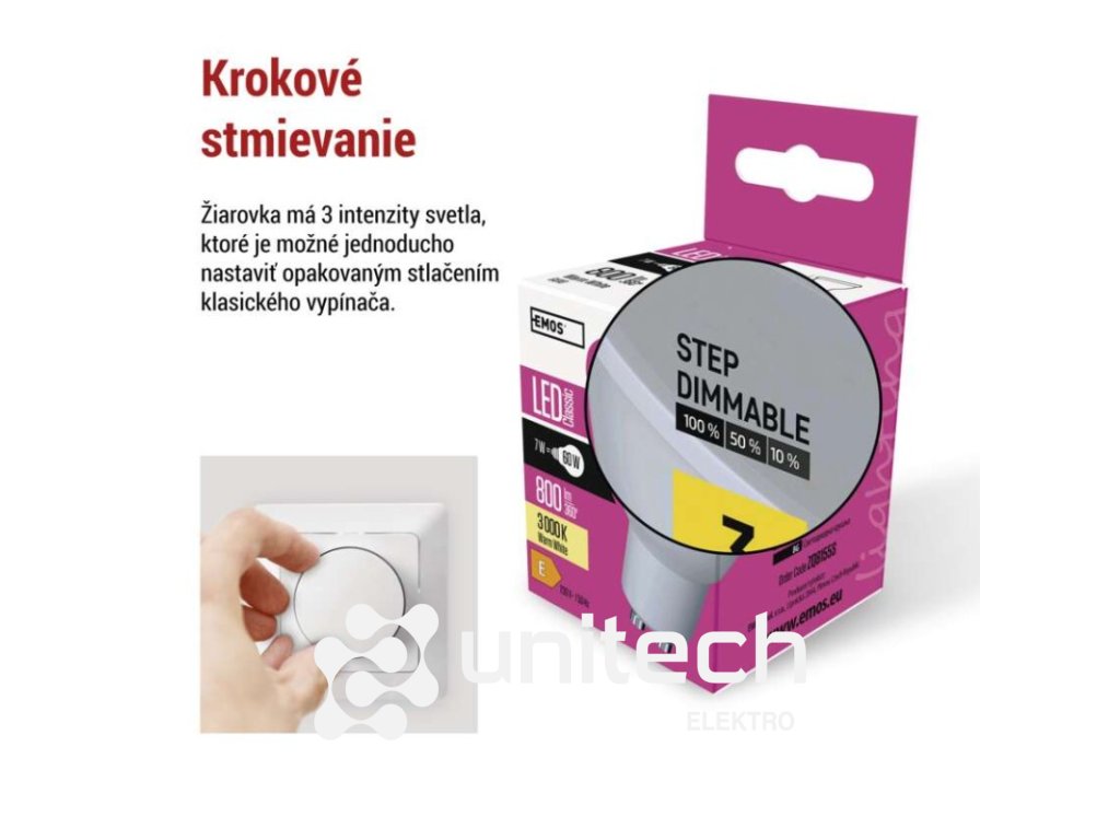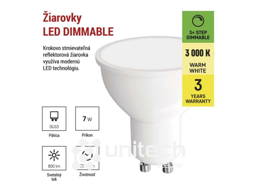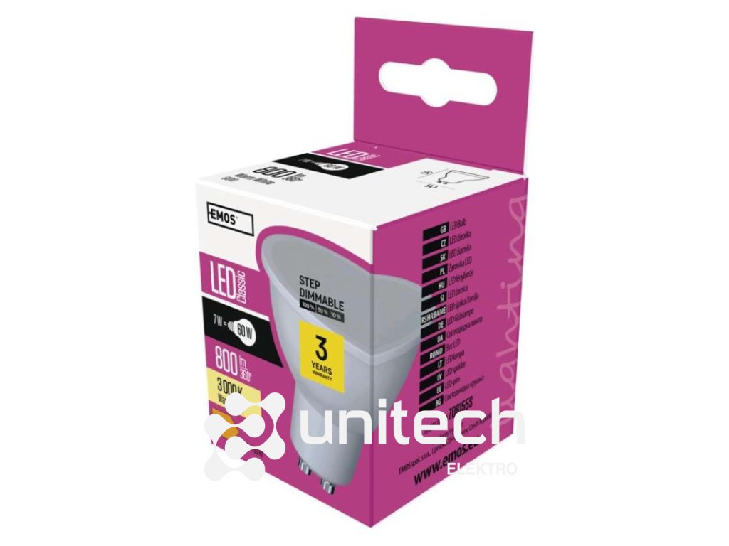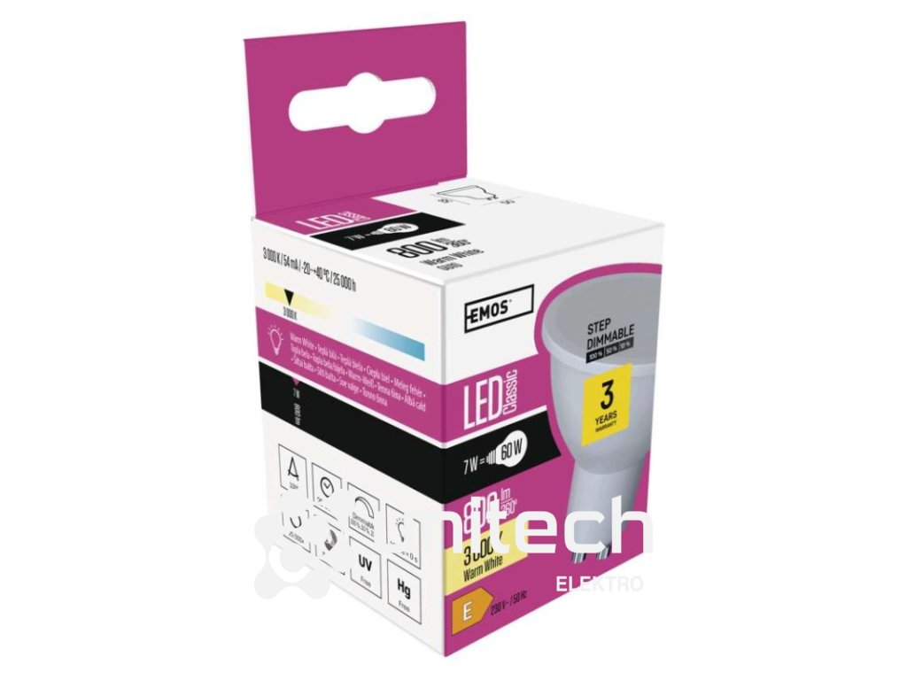 energetická trieda: E|farba svetla: teplá biela|index podania farieb (CRI): Ra >80|kompatibilita: neuvádza sa|náhrada za žiarovku: 60 W|napätie: 230 V~/50 Hz|notifikácie do mobilnej aplikácie: neuvádza sa|ovládanie hlasovými asistentmi: neuvádza sa|pätica (uchytenie žiarovky): GU10|počet čipov: neuvádza sa|počet spínacích cyklov: 25 000|podporované OS: neuvádza sa|predajný obal: 1 ks, krabička|prenosová frekvencia: neuvádza sa|príkon: 7 W|protokol: neuvádza sa|rada: CLASSIC|rozmer: 50 × 50 × 58 mm|stmievateľná: áno|svetelná účinnosť: 114 lm/W|svetelný tok: 800 lm|technológia: LED|teplota chromatičnosti: 3 000 K|tvar: MR16|typ čipov: SMD|účinník: 0,58|uhol vyžarovania: 100°|záručná doba: 3 roky|životnosť: 25 000 hodínDodatočné parametre