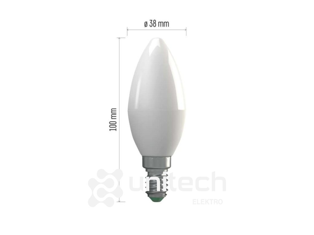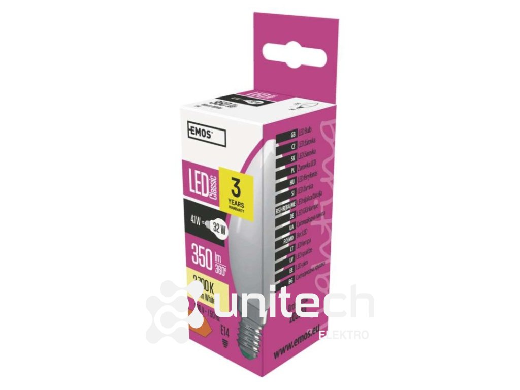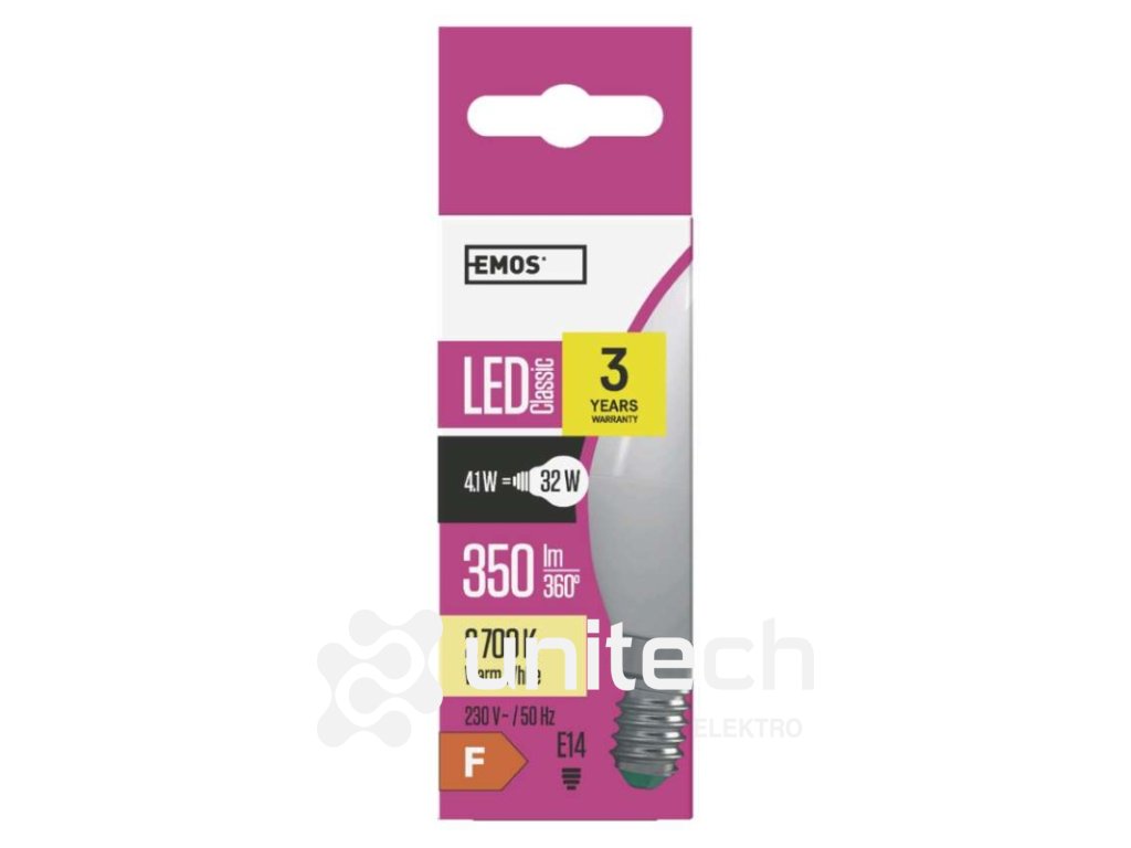 energetická trieda: F|farba svetla: teplá biela|index podania farieb (CRI): Ra >80|kompatibilita: –|náhrada za žiarovku: 32 W|napätie: 230 V~/50 Hz|notifikácie do mobilnej aplikácie: –|ovládanie hlasovými asistentmi: –|pätica (uchytenie žiarovky): E14|počet čipov: neuvádza sa|počet spínacích cyklov: 25 000|podporované OS: –|predajný obal: 1 ks, krabička|prenosová frekvencia: –|príkon: 4,1 W|protokol: –|rada: CLASSIC|rozmer: 100 × 38 × 38 mm|stmievateľná: nie|svetelná účinnosť: 85 lm/W|svetelný tok: 350 lm|technológia: LED|teplota chromatičnosti: 2 700 K|tvar: sviečka|typ čipov: SMD|účinník: 0,45|uhol vyžarovania: 210°|záručná doba: 3 roky|životnosť: 30 000 hodínDodatočné parametre