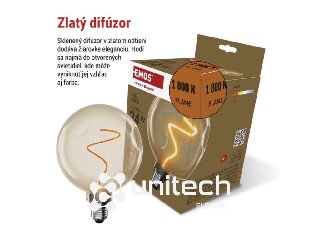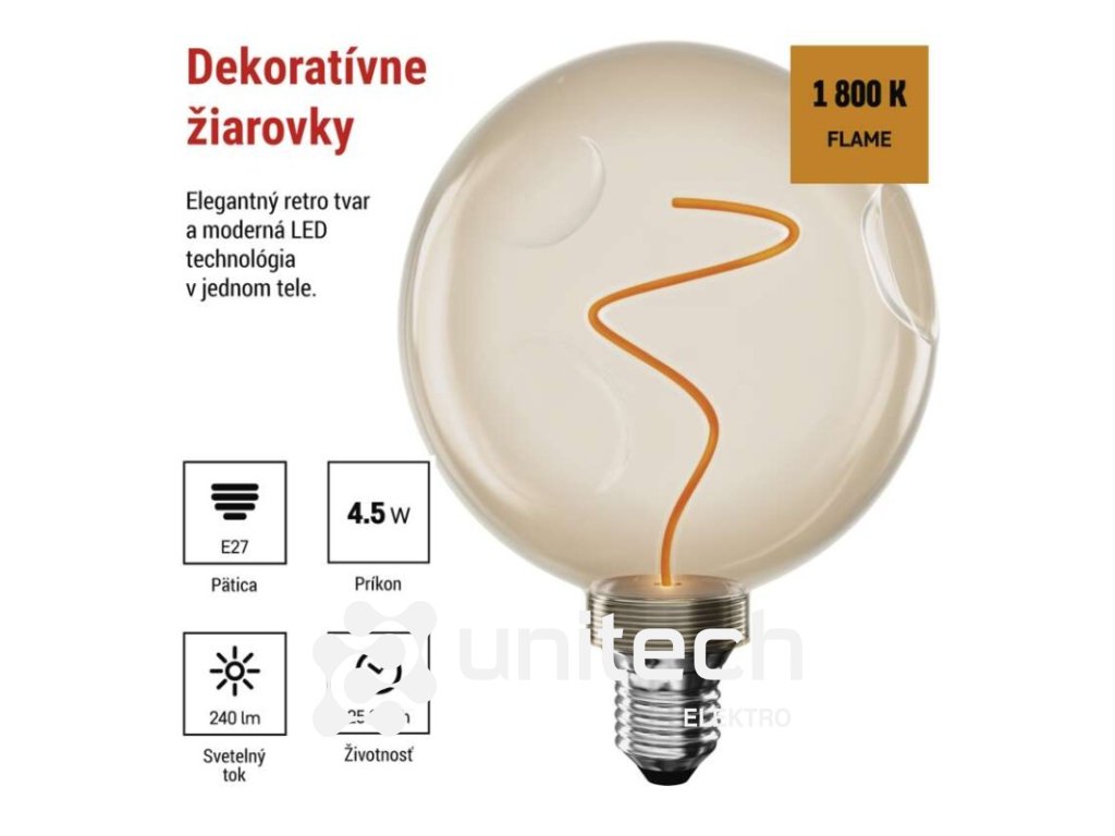 energetická trieda: G|farba svetla: Flame|index podania farieb (CRI): Ra >80|kompatibilita: neuvádza sa|náhrada za žiarovku: 24 W|napätie: 230 V~/50 Hz|notifikácie do mobilnej aplikácie: neuvádza sa|ovládanie hlasovými asistentmi: neuvádza sa|pätica (uchytenie žiarovky): E27|počet čipov: neuvádza sa|počet spínacích cyklov: 25 000|podporované OS: neuvádza sa|predajný obal: 1 ks, krabička|prenosová frekvencia: neuvádza sa|príkon: 4,5 W|protokol: neuvádza sa|rada: DECO|rozmer: 125 × 125 × 164 mm|stmievateľná: nie|svetelná účinnosť: 53 lm/W|svetelný tok: 240 lm|technológia: LED|teplota chromatičnosti: 1 800 K|tvar: CG125A|typ čipov: COB|účinník: 0,40|uhol vyžarovania: 330°|záručná doba: 2 roky|životnosť: 25 000 hodínDodatočné parametre
