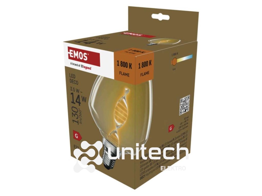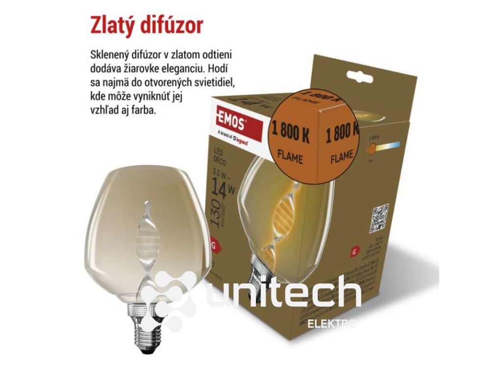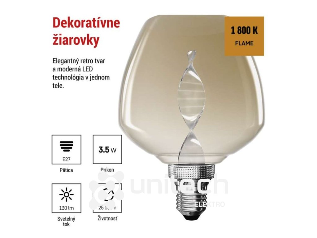 #: 50/60 Hz|energetická trieda: G|farba svetla: Flame|index podania farieb (CRI): Ra >80|kompatibilita: –|náhrada za žiarovku: 14 W|napätie: 220-240 V~|notifikácie do mobilnej aplikácie: –|ovládanie hlasovými asistentmi: –|pätica (uchytenie žiarovky): E27|počet čipov: –|počet spínacích cyklov: 25 000|podporované OS: –|predajný obal: 1 ks, krabička|prenosová frekvencia: –|príkon: 3,5 W|protokol: –|rada: DECO|rozmer: 123 × 123 × 163 mm|stmievateľná: nie|svetelná účinnosť: 37 lm/W|svetelný tok: 130 lm|technológia: LED|teplota chromatičnosti: 1 800 K|tvar: S123|typ čipov: COB|účinník: 0,40|uhol vyžarovania: 330°|záručná doba: 2 roky|životnosť: 25 000 hodínDodatočné parametre