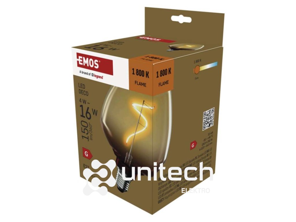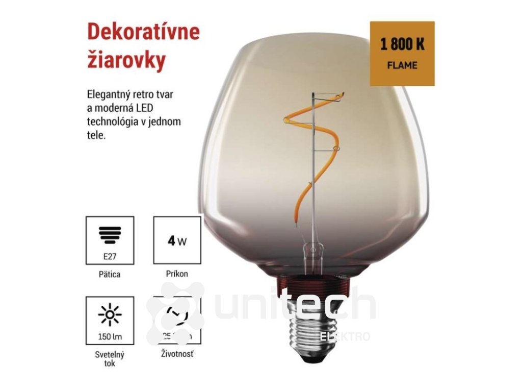 energetická trieda: G|farba svetla: Flame|index podania farieb (CRI): Ra >80|kompatibilita: neuvádza sa|náhrada za žiarovku: 16 W|napätie: 230 V~/50 Hz|notifikácie do mobilnej aplikácie: neuvádza sa|ovládanie hlasovými asistentmi: neuvádza sa|pätica (uchytenie žiarovky): E27|počet čipov: neuvádza sa|počet spínacích cyklov: 25 000|podporované OS: neuvádza sa|predajný obal: 1 ks, krabička|prenosová frekvencia: neuvádza sa|príkon: 4 W|protokol: neuvádza sa|rada: DECO|rozmer: 123 × 123 × 163 mm|stmievateľná: nie|svetelná účinnosť: 38 lm/W|svetelný tok: 150 lm|technológia: LED|teplota chromatičnosti: 1 800 K|tvar: S123|typ čipov: COB|účinník: 0,40|uhol vyžarovania: 330°|záručná doba: 2 roky|životnosť: 25 000 hodínDodatočné parametre