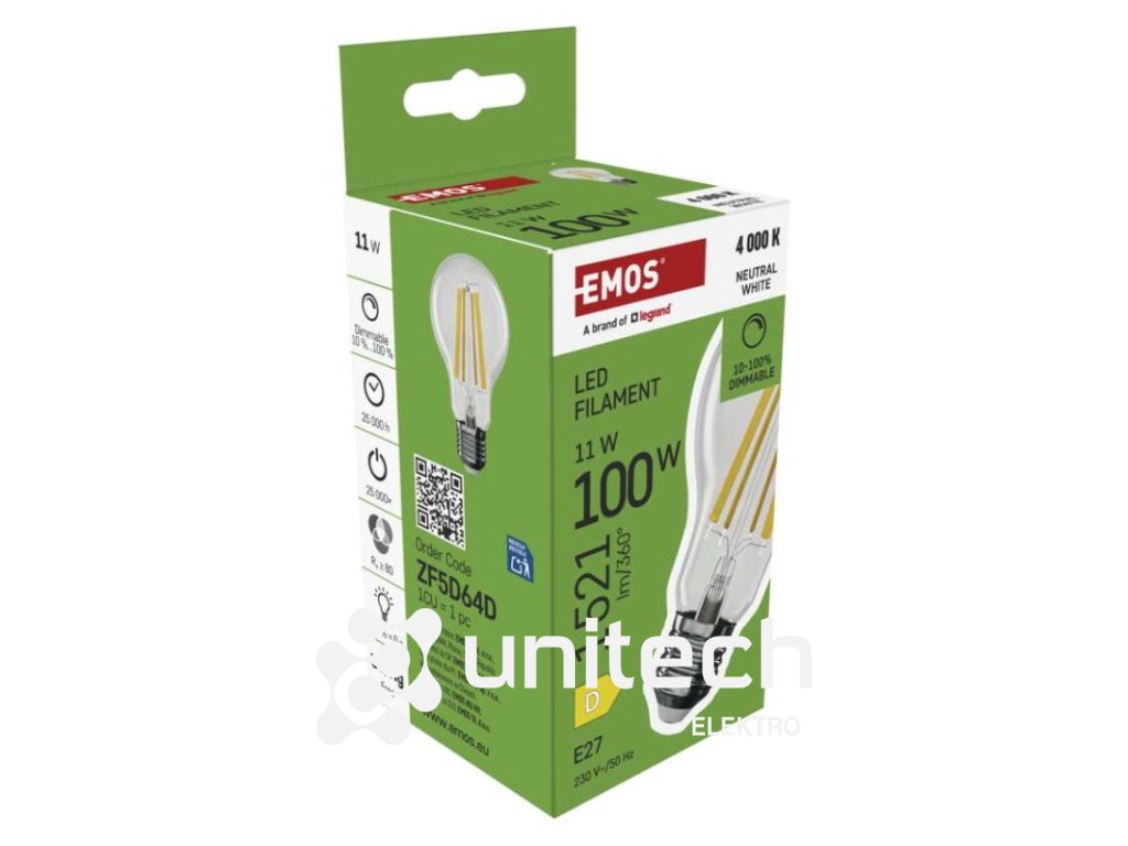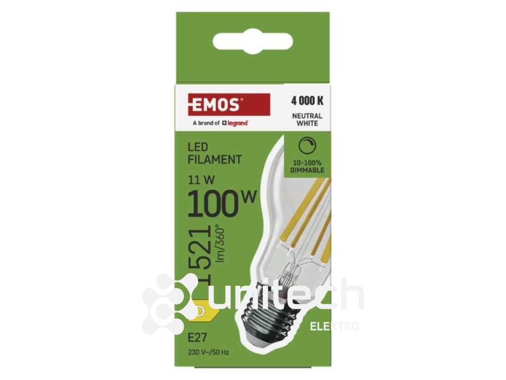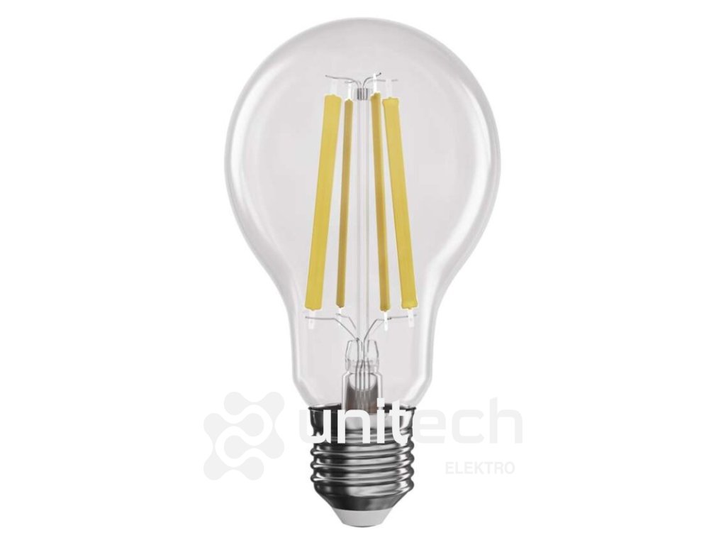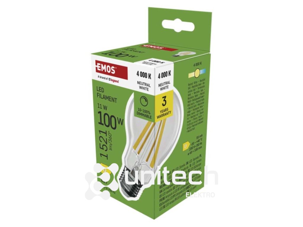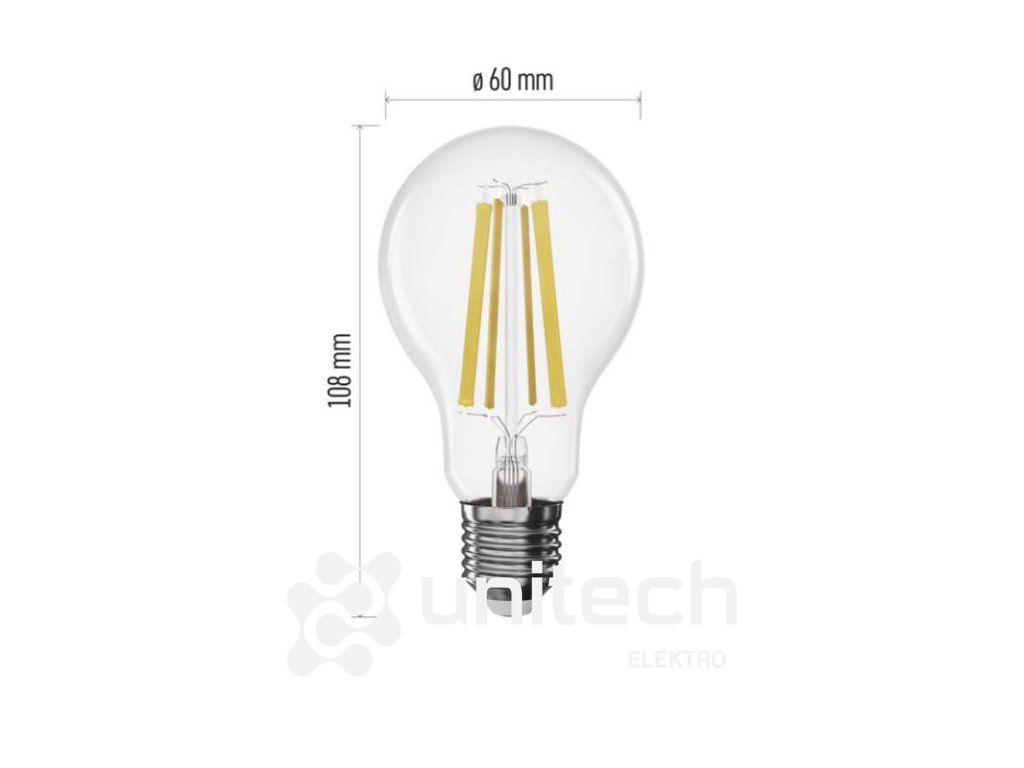 energetická trieda: D|farba svetla: neutrálna biela|index podania farieb (CRI): Ra >80|kompatibilita: –|náhrada za žiarovku: 100 W|napätie: 230 V~/50 Hz|notifikácie do mobilnej aplikácie: –|ovládanie hlasovými asistentmi: –|pätica (uchytenie žiarovky): E27|počet čipov: neuvádza sa|počet spínacích cyklov: 25 000|podporované OS: –|predajný obal: 1 ks, krabička|prenosová frekvencia: –|príkon: 11 W|protokol: –|rada: FILAMENT|rozmer: 60 × 60 × 108 mm|stmievateľná: áno|svetelná účinnosť: 138 lm/W|svetelný tok: 1 521 lm|technológia: LED|teplota chromatičnosti: 4 000 K|tvar: A60|typ čipov: COB|účinník: 0,95|uhol vyžarovania: 320°|záručná doba: 3 roky|životnosť: 25 000 hodínDodatočné parametre