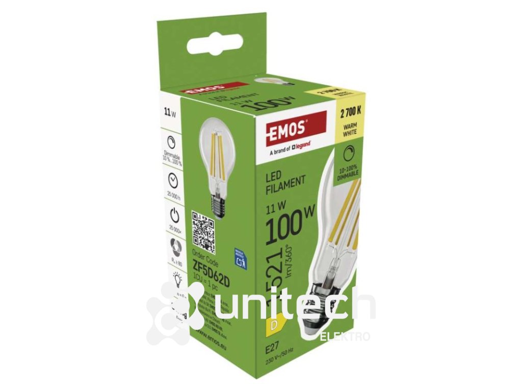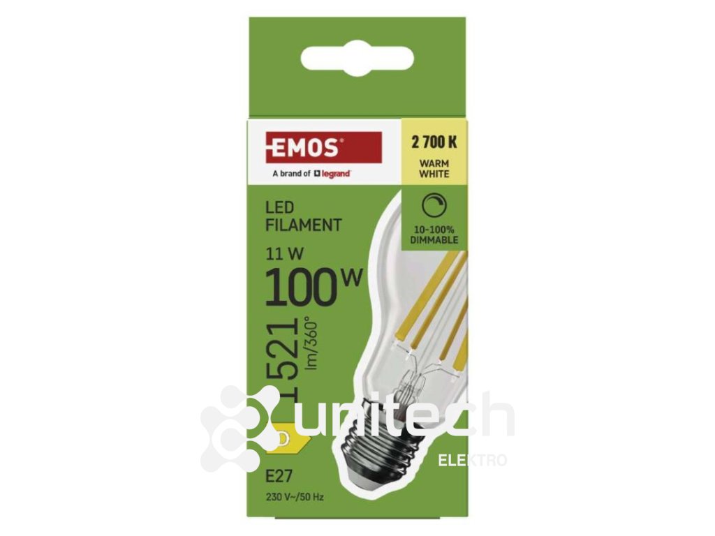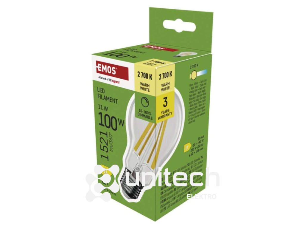 energetická trieda: D|farba svetla: teplá biela|index podania farieb (CRI): Ra >80|kompatibilita: –|náhrada za žiarovku: 100 W|napätie: 230 V~/50 Hz|notifikácie do mobilnej aplikácie: –|ovládanie hlasovými asistentmi: –|pätica (uchytenie žiarovky): E27|počet čipov: neuvádza sa|počet spínacích cyklov: 25 000|podporované OS: –|predajný obal: 1 ks, krabička|prenosová frekvencia: –|príkon: 11 W|protokol: –|rada: FILAMENT|rozmer: 60 × 60 × 108 mm|stmievateľná: áno|svetelná účinnosť: 138 lm/W|svetelný tok: 1 521 lm|technológia: LED|teplota chromatičnosti: 2 700 K|tvar: A60|typ čipov: COB|účinník: 0.94|uhol vyžarovania: 320°|záručná doba: 3 roky|životnosť: 25 000 hodínDodatočné parametre