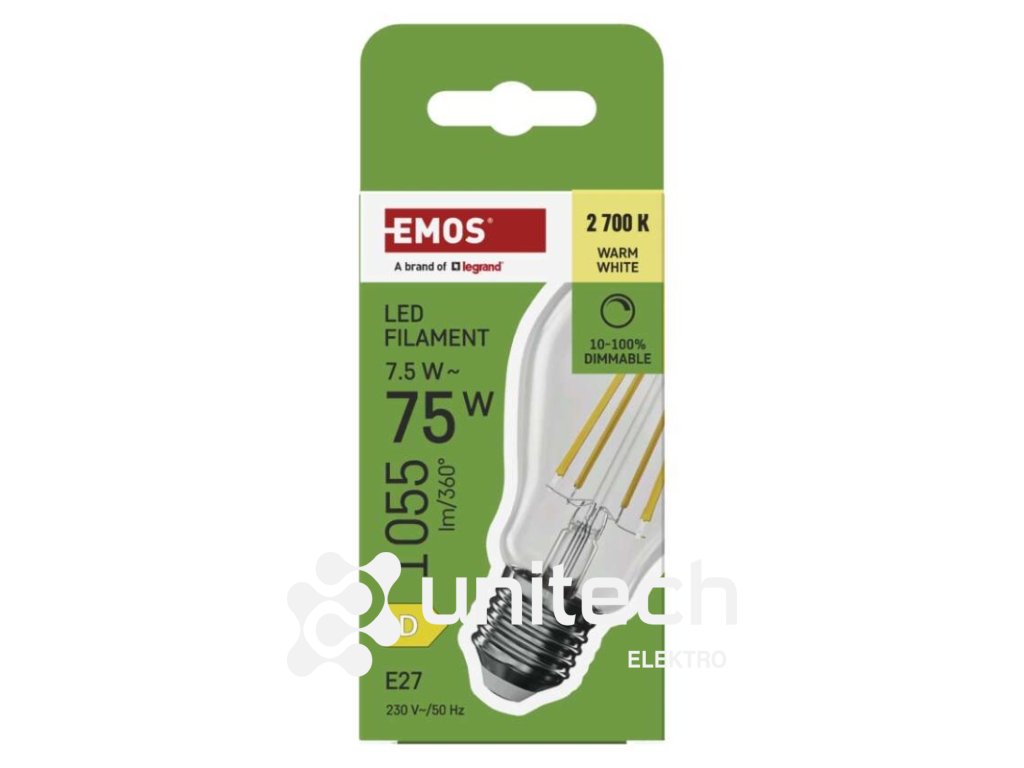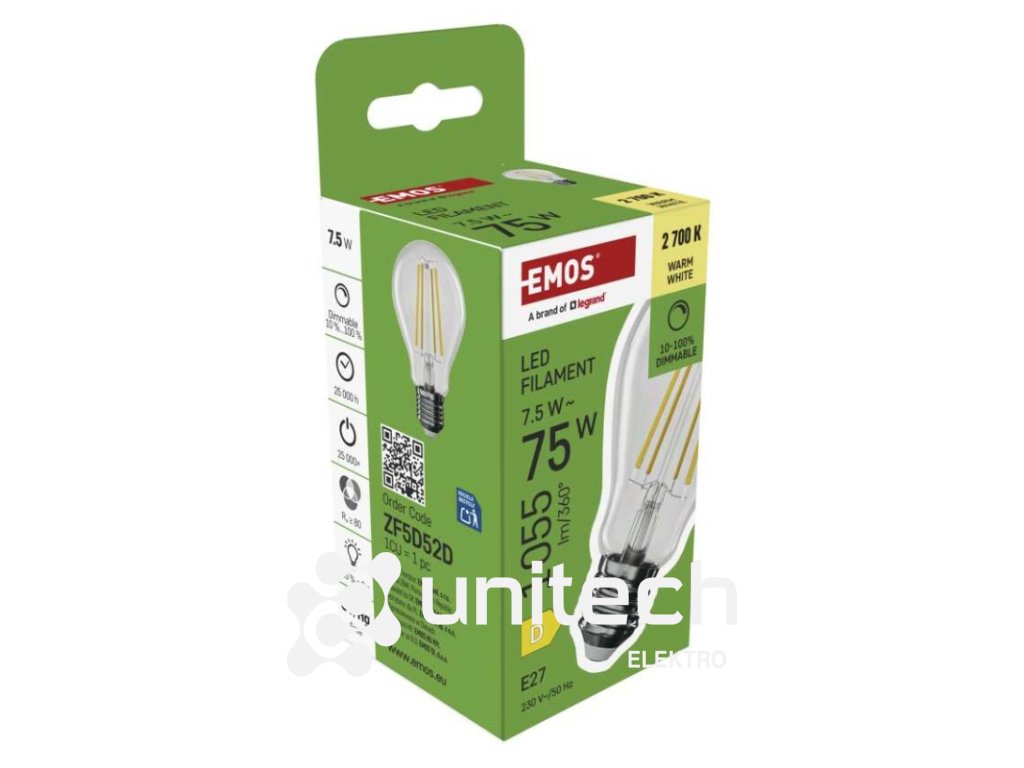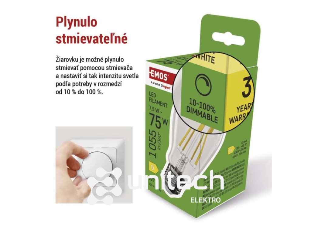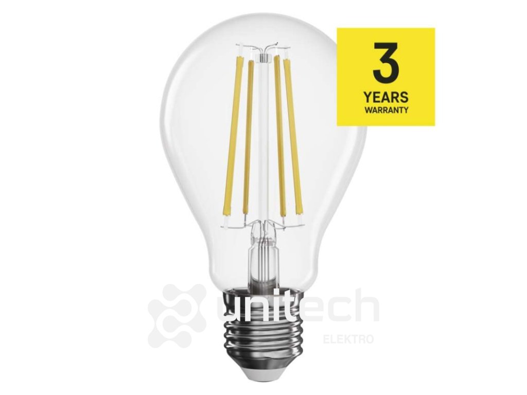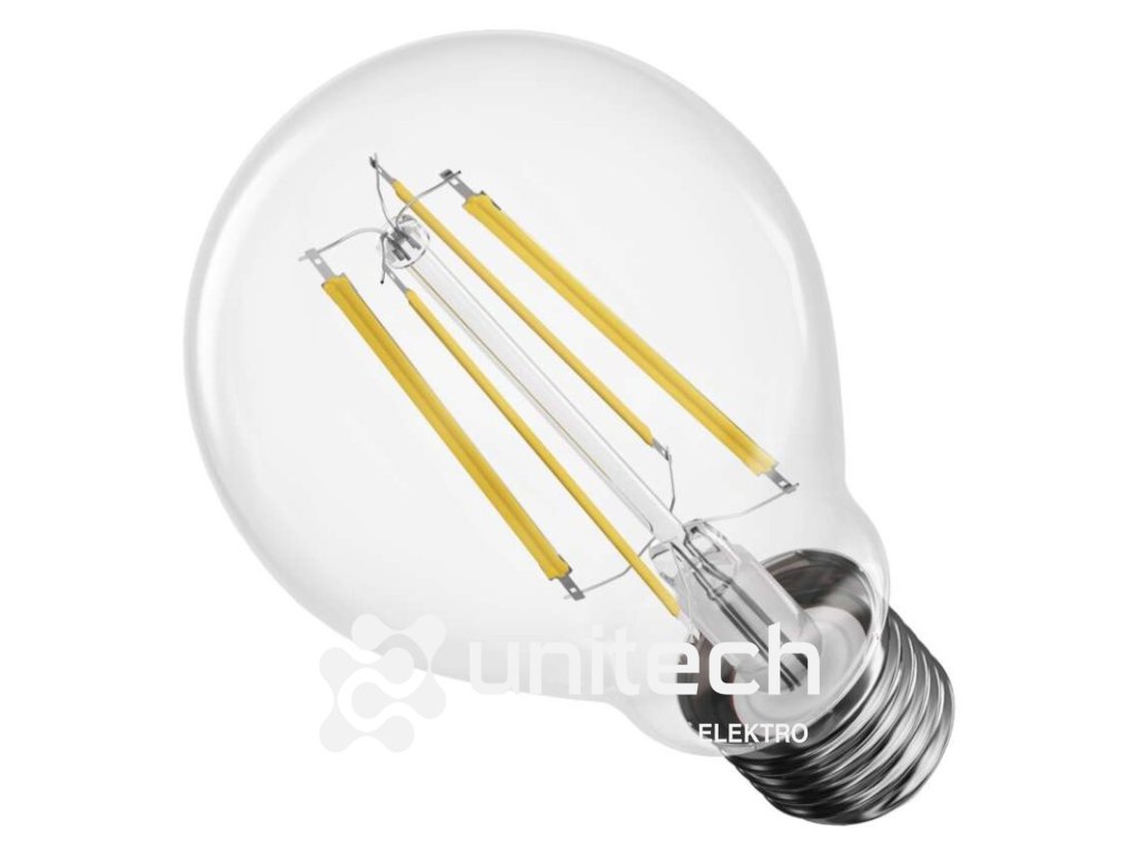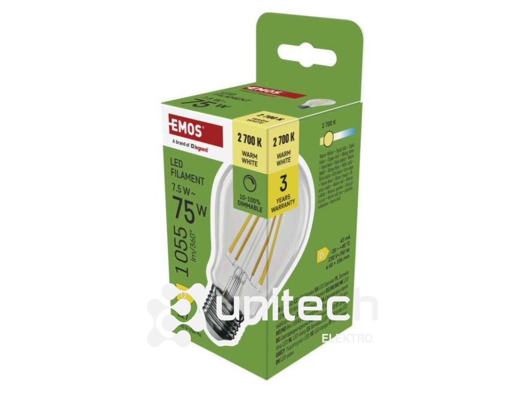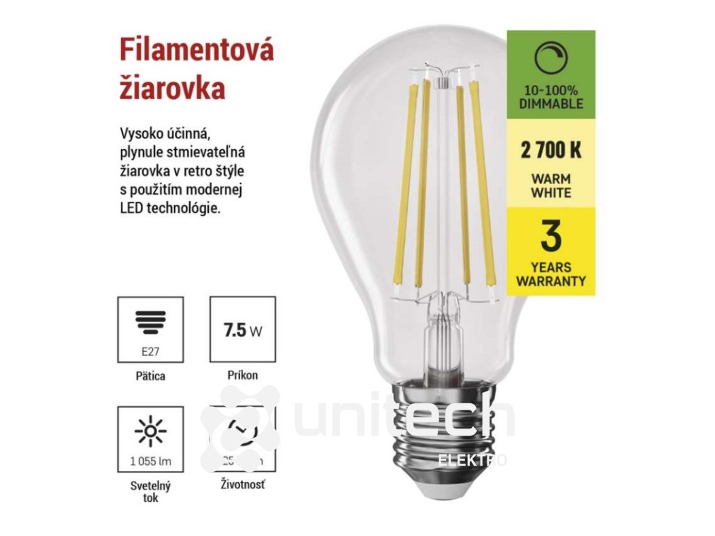 energetická trieda: D|farba svetla: teplá biela|index podania farieb (CRI): Ra >80|kompatibilita: neuvádza sa|náhrada za žiarovku: 75 W|napätie: 230 V~/50 Hz|notifikácie do mobilnej aplikácie: neuvádza sa|ovládanie hlasovými asistentmi: neuvádza sa|pätica (uchytenie žiarovky): E27|počet čipov: neuvádza sa|počet spínacích cyklov: 25 000|podporované OS: neuvádza sa|predajný obal: 1 ks, krabička|prenosová frekvencia: neuvádza sa|príkon: 7,5 W|protokol: neuvádza sa|rada: FILAMENT|rozmer: 60 × 60 × 106 mm|stmievateľná: áno|svetelná účinnosť: 141 lm/W|svetelný tok: 1 055 lm|technológia: LED|teplota chromatičnosti: 2 700 K|tvar: A60|typ čipov: COB|účinník: 0,73|uhol vyžarovania: 320°|záručná doba: 3 roky|životnosť: 25 000 hodínDodatočné parametre