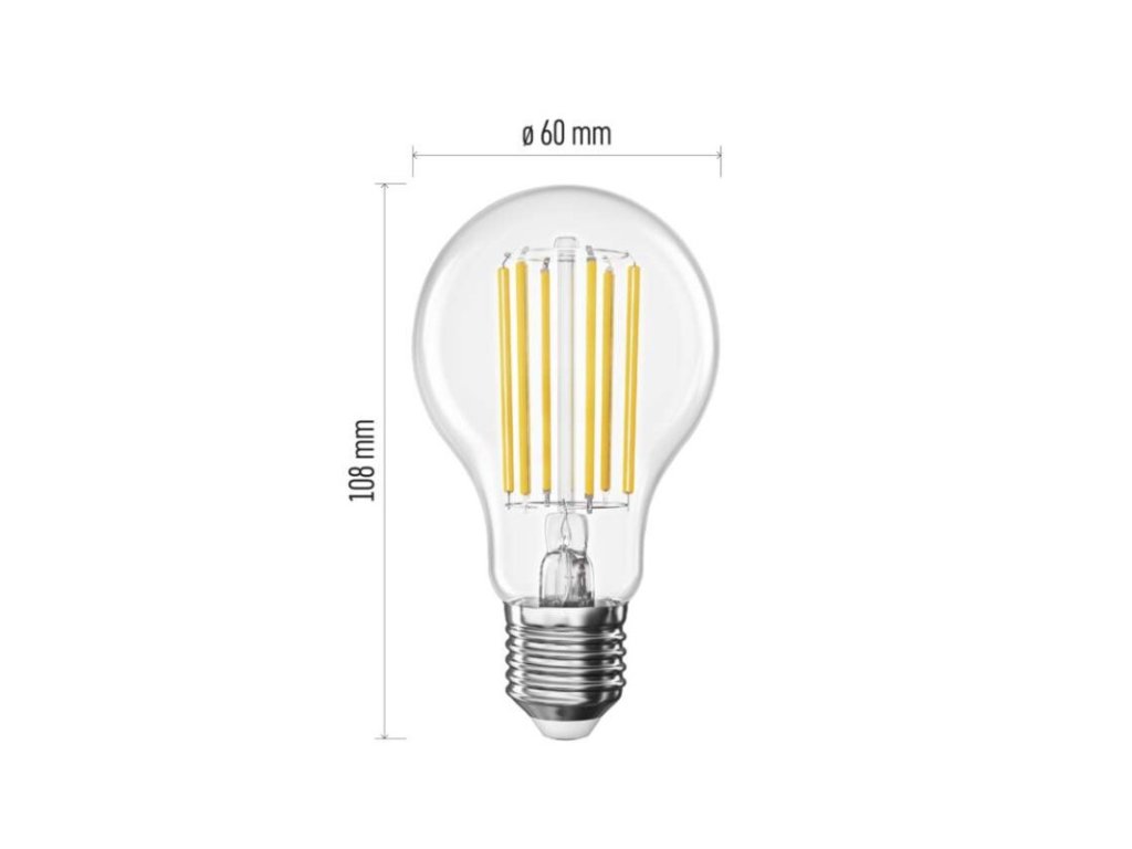 energetická trieda: A|farba svetla: teplá biela|index podania farieb (CRI): Ra >80|kompatibilita: neuvádza sa|náhrada za žiarovku: 100 W|napätie: 230 V~/50 Hz|notifikácie do mobilnej aplikácie: neuvádza sa|ovládanie hlasovými asistentmi: neuvádza sa|pätica (uchytenie žiarovky): E27|počet čipov: neuvádza sa|počet spínacích cyklov: 30 000|podporované OS: neuvádza sa|predajný obal: 1 ks, krabička|prenosová frekvencia: neuvádza sa|príkon: 7,2 W|protokol: neuvádza sa|rada: FILAMENT|rozmer: 60 × 60 × 108 mm|stmievateľná: nie|svetelná účinnosť: 211 lm/W|svetelný tok: 1 521 lm|technológia: LED|teplota chromatičnosti: 2 700 K|tvar: A60|typ čipov: COB|účinník: 0,58|uhol vyžarovania: 360°|záručná doba: 5 rokov|životnosť: 50 000 hodínDodatočné parametre