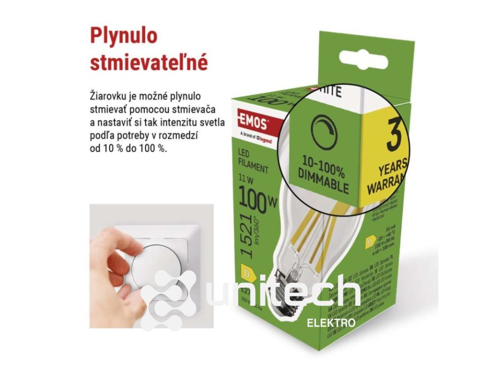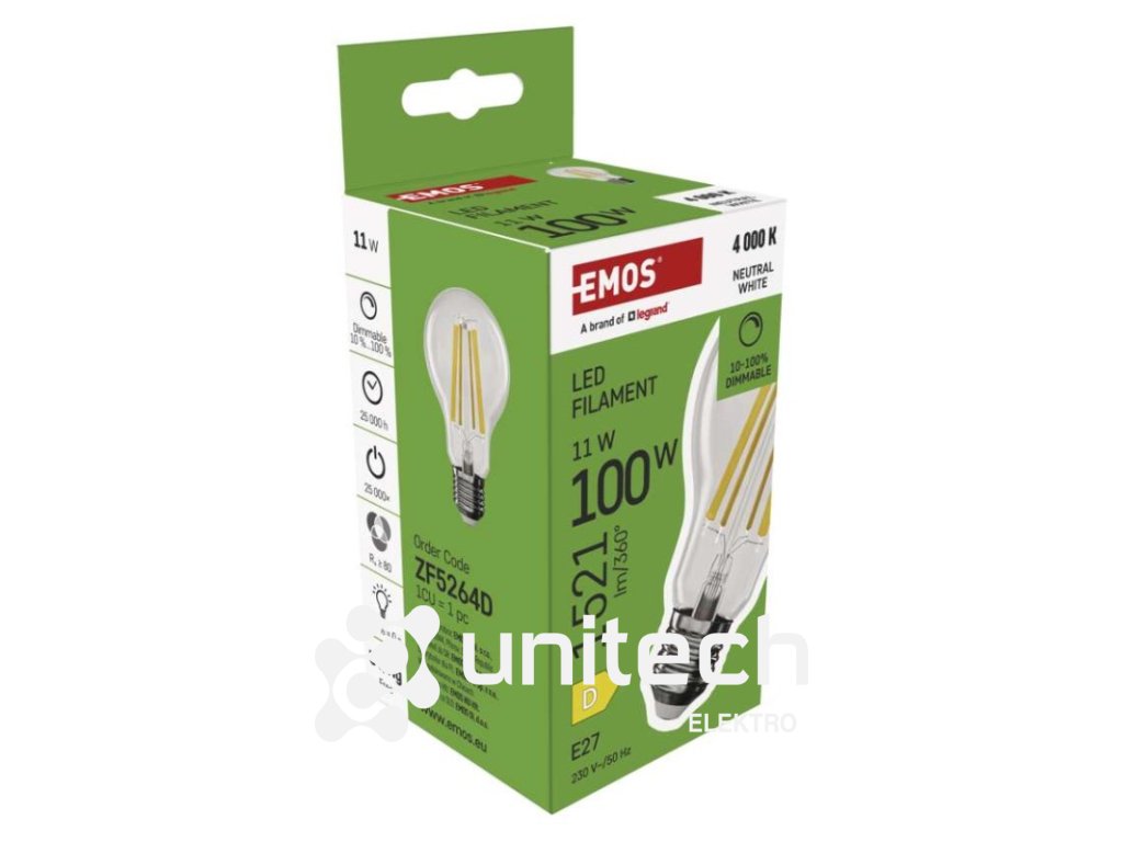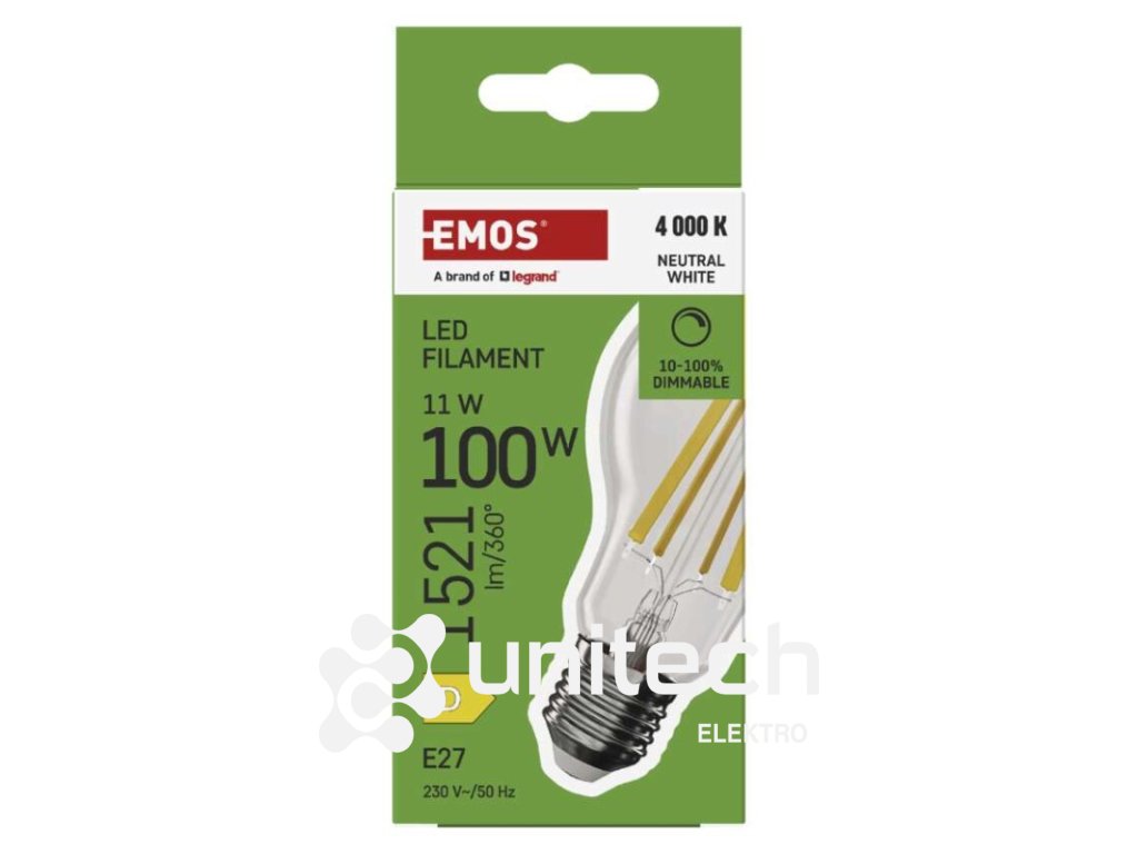 energetická trieda: D|farba svetla: neutrálna biela|index podania farieb (CRI): Ra >80|kompatibilita: –|náhrada za žiarovku: 100 W|napätie: 230 V~/50 Hz|notifikácie do mobilnej aplikácie: –|ovládanie hlasovými asistentmi: –|pätica (uchytenie žiarovky): E27|počet čipov: neuvádza sa|počet spínacích cyklov: 25 000|podporované OS: –|predajný obal: 1 ks, krabička|prenosová frekvencia: –|príkon: 11 W|protokol: –|rada: FILAMENT|rozmer: 60 × 60 × 108 mm|stmievateľná: áno|svetelná účinnosť: 138 lm/W|svetelný tok: 1 521 lm|technológia: LED|teplota chromatičnosti: 4 000 K|tvar: A60|typ čipov: COB|účinník: 0,95|uhol vyžarovania: 320°|záručná doba: 3 roky|životnosť: 25 000 hodínDodatočné parametre