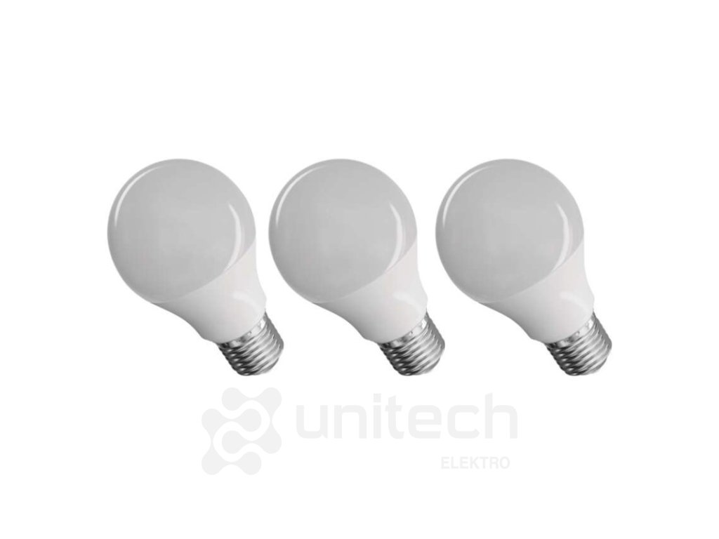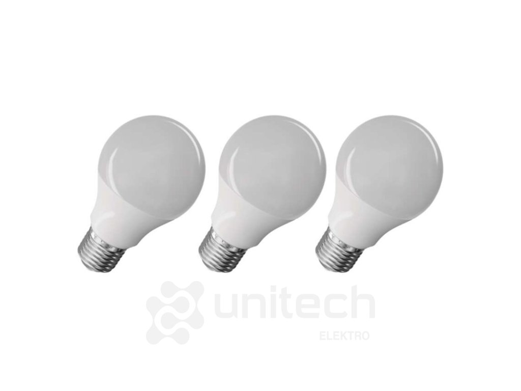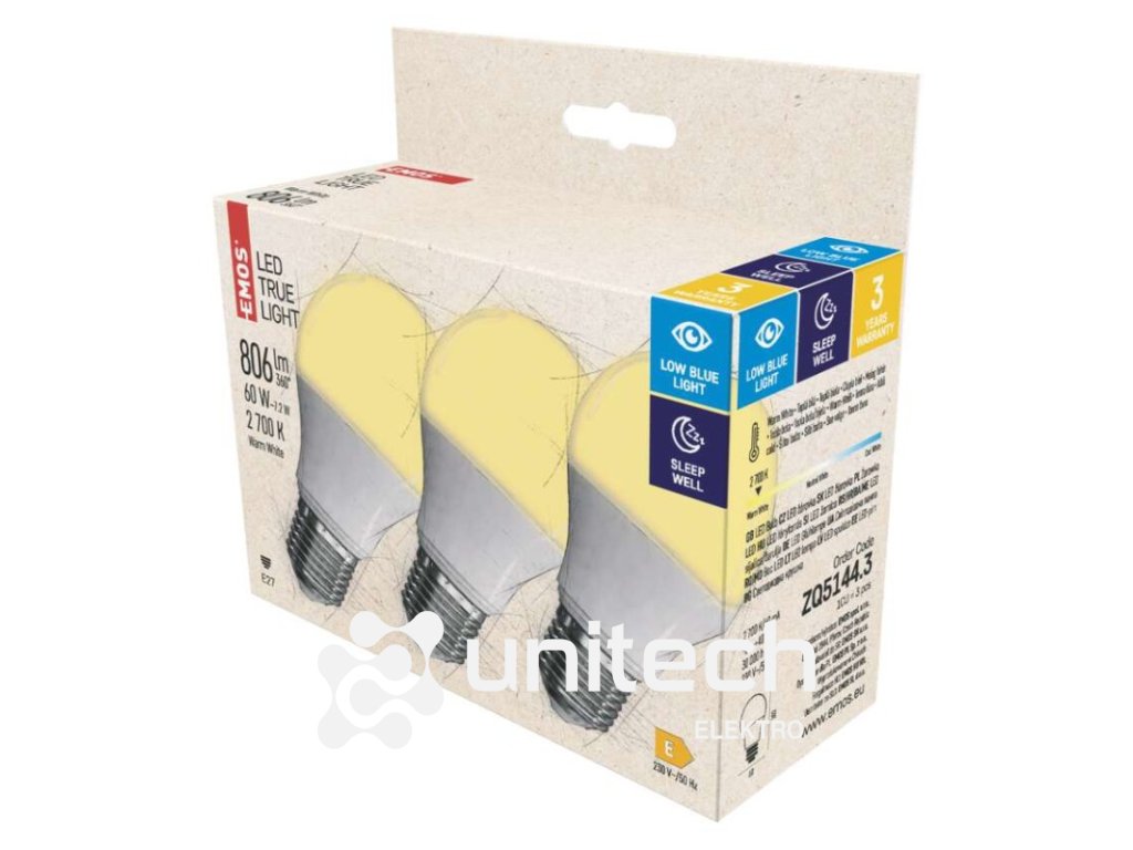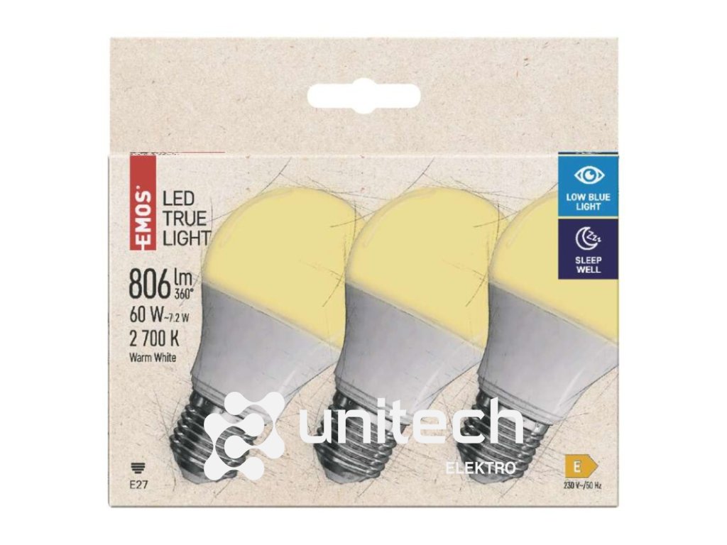 energetická trieda: E|farba svetla: teplá biela|index podania farieb (CRI): Ra >94|kompatibilita: –|náhrada za žiarovku: 60 W|napätie: 230 V~/50 Hz|notifikácie do mobilnej aplikácie: –|ovládanie hlasovými asistentmi: –|pätica (uchytenie žiarovky): E27|počet čipov: 20|počet spínacích cyklov: 25 000|podporované OS: –|predajný obal: 3 ks, krabička|prenosová frekvencia: –|príkon: 7,2 W|protokol: –|rada: TRUE LIGHT|rozmer: 102 × 60 × 60 mm|stmievateľná: nie|svetelná účinnosť: 112 lm/W|svetelný tok: 806 lm|technológia: LED|teplota chromatičnosti: 2 700 K|tvar: A60|typ čipov: SMD|účinník: 0,57|uhol vyžarovania: 180°|záručná doba: 3 roky|životnosť: 30 000 hodínDodatočné parametre