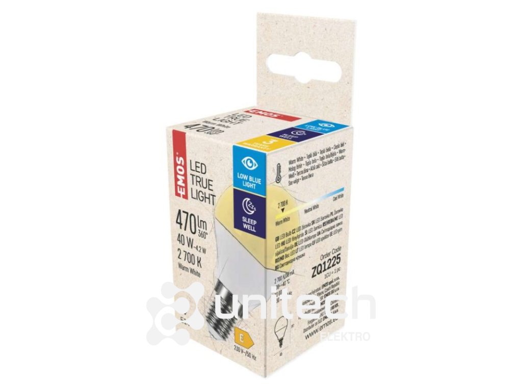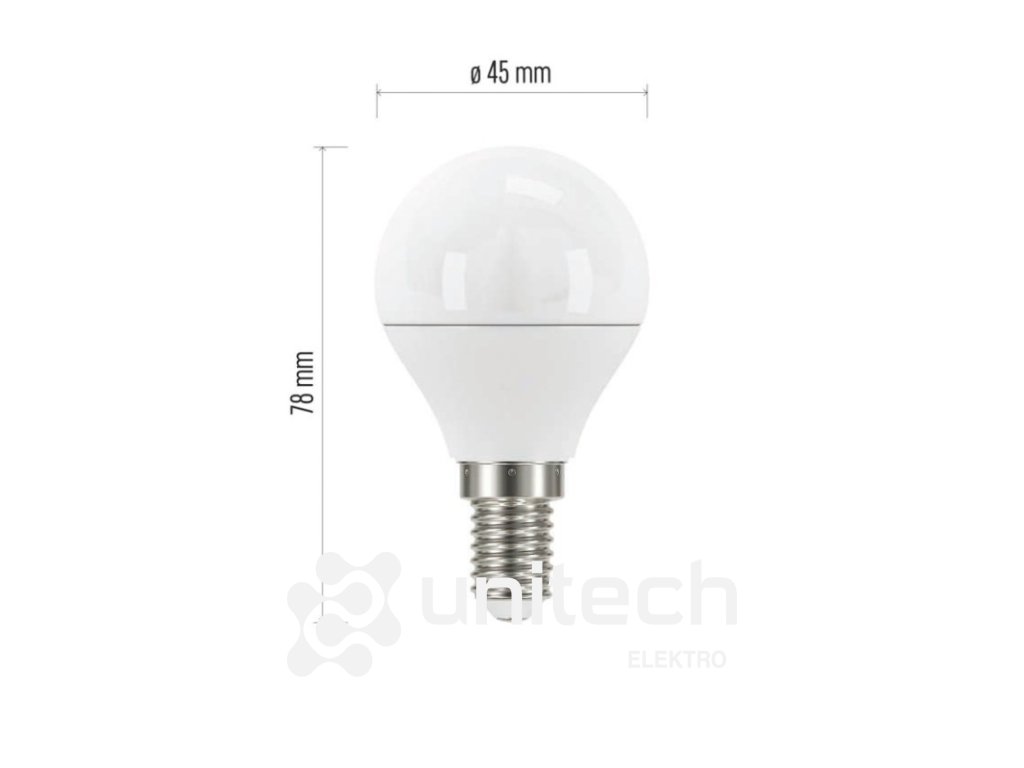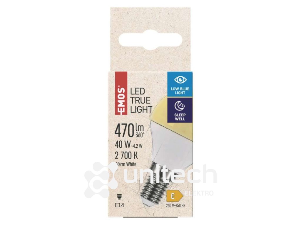 energetická trieda: E|farba svetla: teplá biela|index podania farieb (CRI): Ra >94|kompatibilita: –|náhrada za žiarovku: 40 W|napätie: 230 V~/50 Hz|notifikácie do mobilnej aplikácie: –|ovládanie hlasovými asistentmi: –|pätica (uchytenie žiarovky): E14|počet čipov: 18|počet spínacích cyklov: 25 000|podporované OS: –|predajný obal: 1 ks, krabička|prenosová frekvencia: –|príkon: 4,2 W|protokol: –|rada: TRUE LIGHT|rozmer: 78 × 45 × 45 mm|stmievateľná: nie|svetelná účinnosť: 112 lm/W|svetelný tok: 470 lm|technológia: LED|teplota chromatičnosti: 2 700 K|tvar: Mini Globe|typ čipov: SMD|účinník: 0.50|uhol vyžarovania: 200°|záručná doba: 3 roky|životnosť: 30 000 hodínDodatočné parametre
