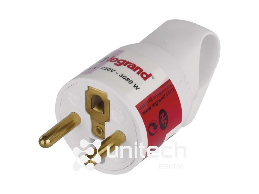 detské clonky: nie|diaľkový ovládač: –|dosah signálu: –|easy learning: –|farba: biela|krytie: IP20|materiál: plast|max. záťaž: 3 680 W|možnosť ovládania: –|napätie/prúd: 250 V~/16 A max.|počet pólov: –|počet zásuviek: –|pozície ochranného kontaktu: –|predajný obal: 1 ks, nálepka|prenosová frekvencia: –|produkt: LEGRAND vidlica s úchytom|typ: FRENCH|vonkajšie použitie: nie|vypínač: nieDodatočné parametre