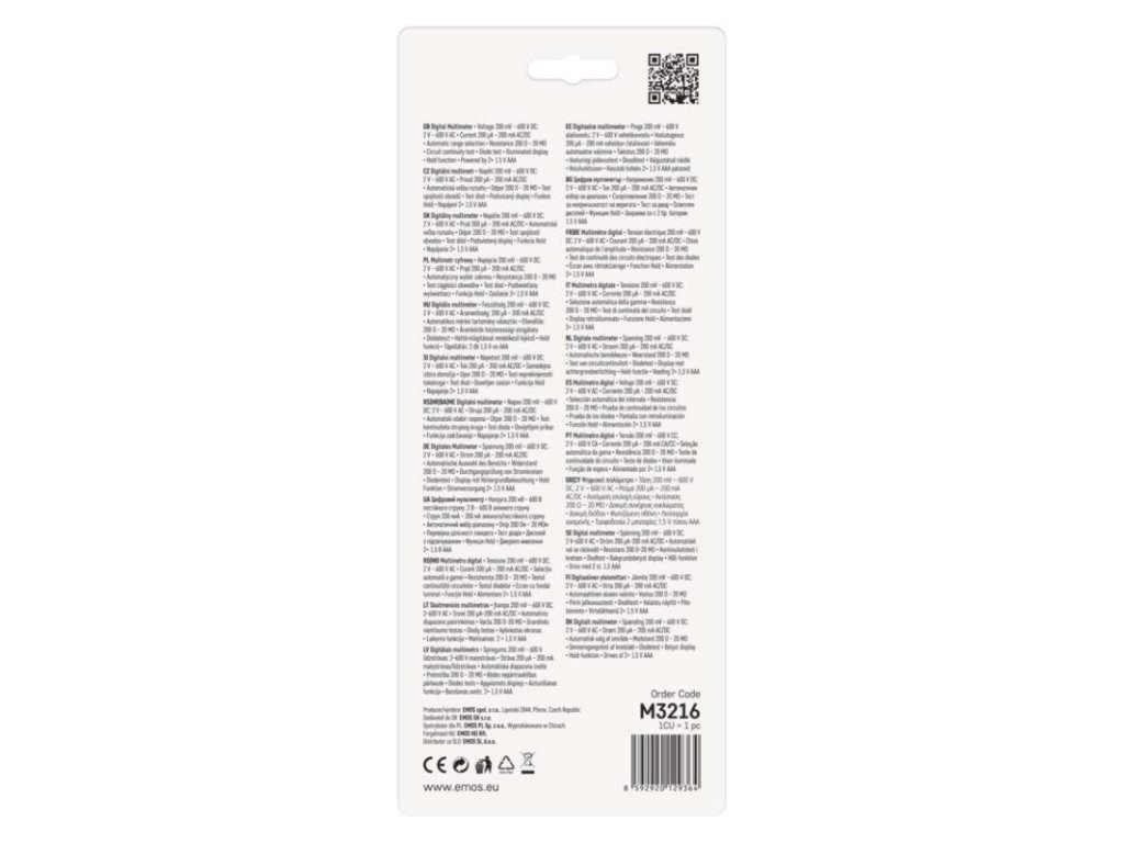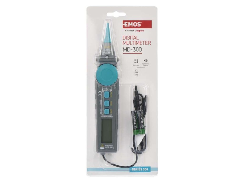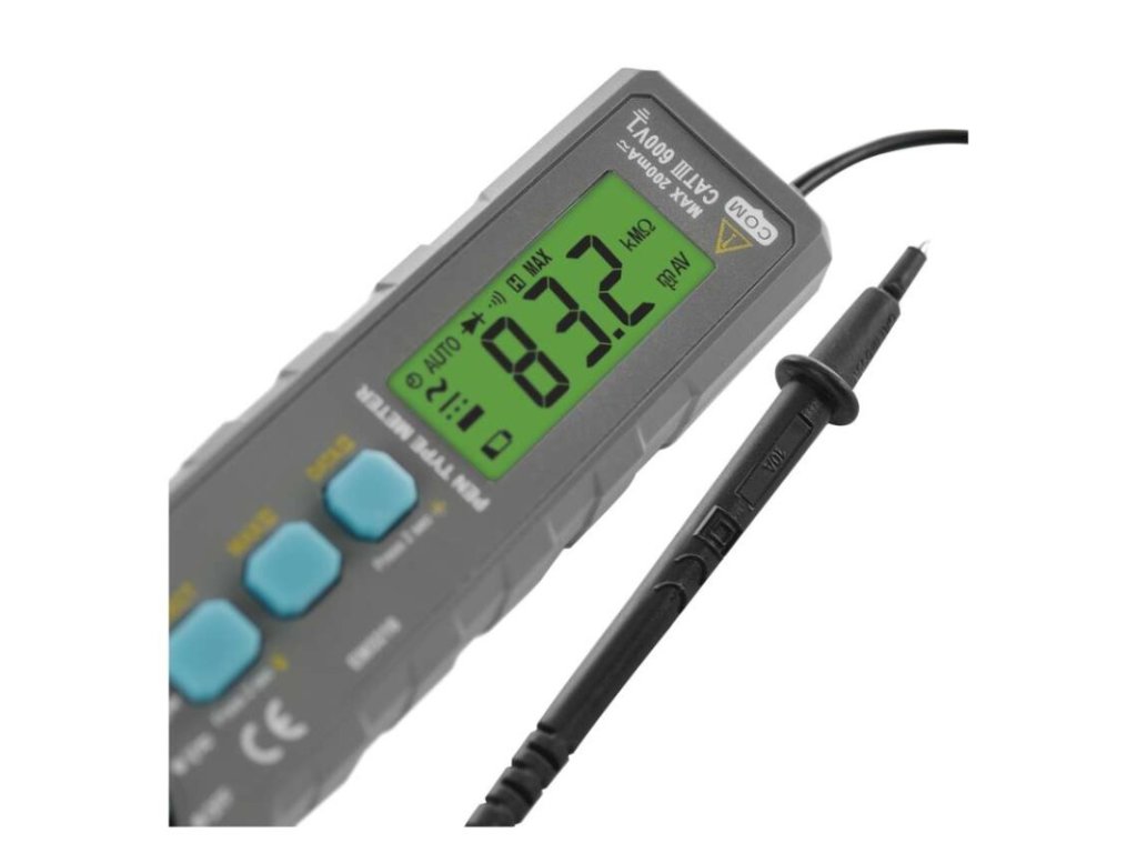 AC napätie: 2–600 V|AC prúd: 200 µA – 200 mA|automatické vypnutie: áno|bezkontaktná detekcia AC napätia: nie|DC napätie: 200 mV – 600 V|DC prúd: 200 µA – 200 mA|elektrický odpor: 200 Ohm – 20 MOhm|indikácia slabej batérie: áno|kliešťový multimeter: nie|kontaktná detekcia AC napätia: nie|meranie teploty: nie|napájanie: 2× 1,5 V AAA (súčasťou balenia)|podsvietenie displeja: áno|predajný obal: 1 ks, blister|rozmer: 44 × 38 × 230 mm|spojitosť obvodov: áno|súčasť dodávky: batéria, návod, meracie hroty|test batérií: nie|test diód: áno|test tranzistorov: nie|voľba rozsahu: automatická|záznam max. hodnoty: áno|záznam nameranej hodnoty: áno|zobrazenie displeja: 3 1/2 digitDodatočné parametre