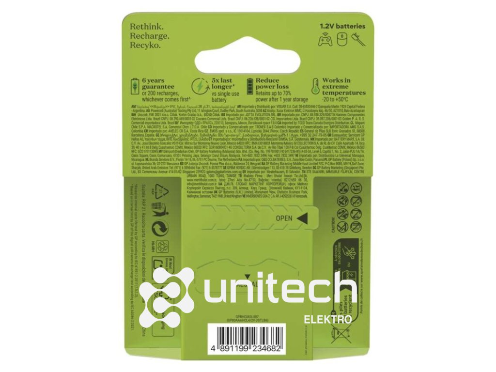 chemické zloženie: NiMH|hmotnosť: 12 g|kapacita: 800 mAh|kategória/rada: Rechargeable|max. skladovateľnosť: neuvádza sa|možnosť nabíjania: áno|napätie: 1,2 V|počet nabíjacích cyklov: viac ako 200|predajný obal: 6 ks, papierová krabička|prevádzková teplota: -20 °C až +50 °C|rozmer: 10,5 × 44,5 mm|typové označenie: HR03 (mikrotužka, AAA)|veľkosť batérie: AAA|značka: GPDodatočné parametre