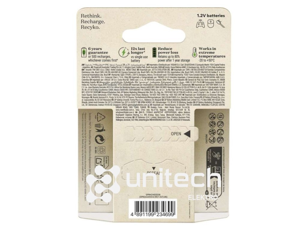 chemické zloženie: NiMH|hmotnosť: 14,5 g|kapacita: 850 mAh|kategória/rada: Rechargeable|max. skladovateľnosť: neuvádza sa|možnosť nabíjania: áno|napätie: 1,2 V|počet nabíjacích cyklov: viac ako 500|predajný obal: 6 ks, papierová krabička|prevádzková teplota: -20 °C až +50 °C|rozmer: 14,5 × 50,5 mm|typové označenie: HR03 (mikrotužka, AAA)|veľkosť batérie: AAA|značka: GPDodatočné parametre