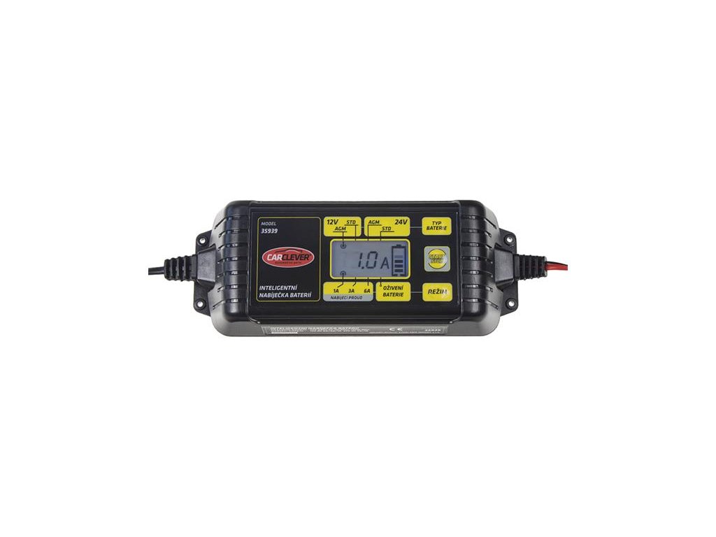 Nabíjačka akumulátorov CARCLEVER 35939 12V/24V 6AInteligentní miniaturní nabíječka s informačním LCD, řízená mikroprocesorem pro olověné akumulátory a funkcí pro ruční rekondici sulfatované baterie. Ideální pro nabíjení a údržbu všech typů olověných baterií 12V/24 V (WET, MF, AGM, GEL). Po nabití akumulátoru se nabíječka automaticky přepne na udržovací nabíjení. Vaše autobaterie tak i při dlouhém odstavení zůstane fit. Součástí nabíječky jsou vyměnitelné nabíjecí koncovky: kabel s klešťovými svorkami, kabel s očky pro přímé připojení k baterii.