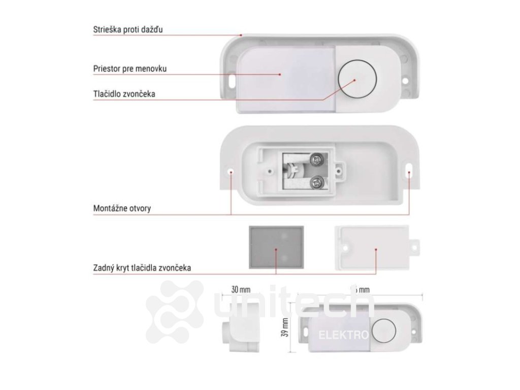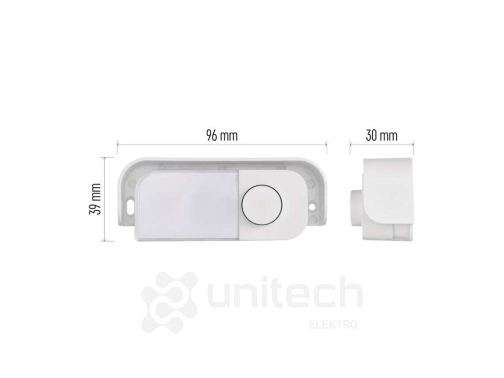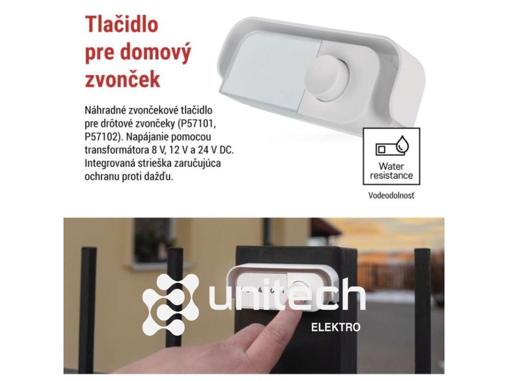 dosah vo voľnom priestore: –|krytie: IP44|napájanie: max. 24 V DC|predajný obal: 1 ks, krabička|prenosová frekvencia: –|rozmer tlačidla: 96 × 30 × 39 mm|spôsob párovania: –|spôsob prenosu: drôtové|určené pre typ zvončeka: P57101, P57102Dodatočné parametre
