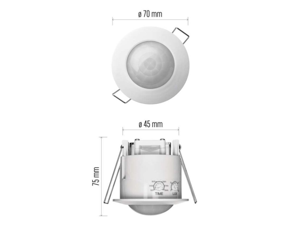 citlivosť: <3 Lux|detekčný dosah: 6 m|detekčný uhol: 360°|doba zopnutia: min. 10 sekúnd – max. 15 minút|farba: biela|krytie: IP20|max. záťaž kapacitná: 200 W|max. záťaž odporová: 1 200 W|napájanie: 230 V~/50 Hz|predajný obal: 1 ks, krabička|rozmer: 70 × 70 × 75 mm|typ senzora: PIRDodatočné parametre