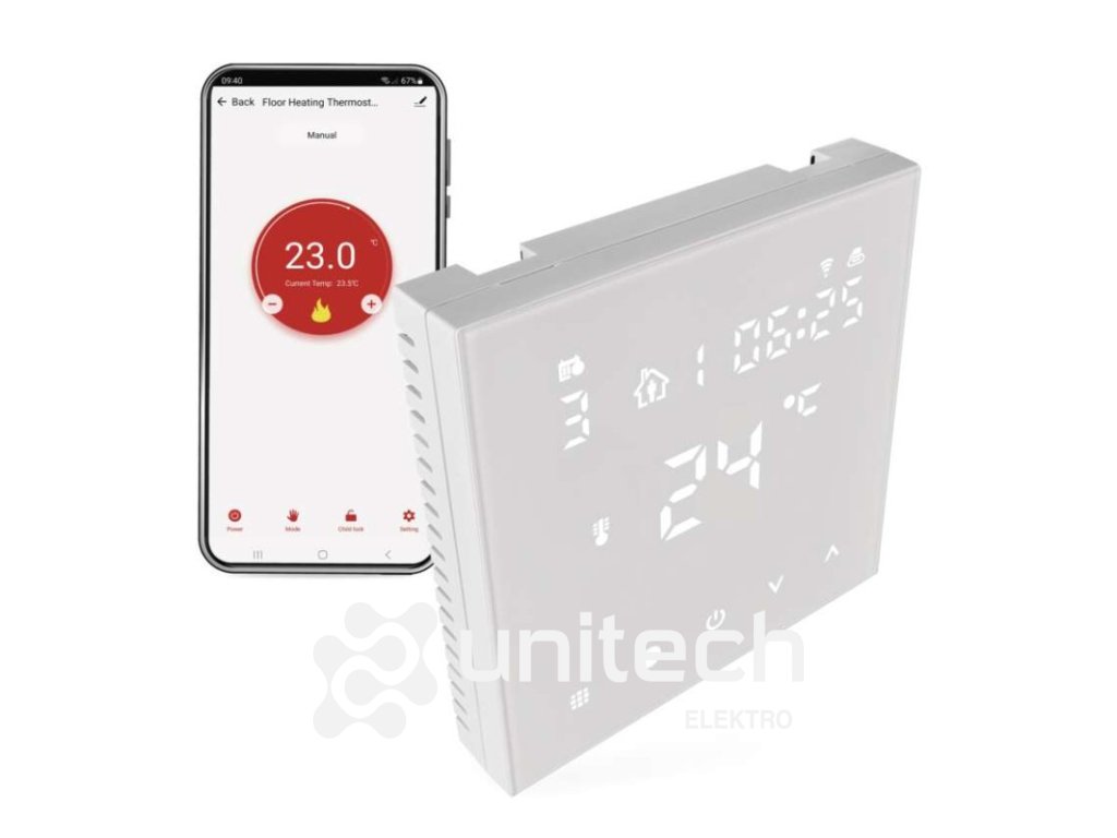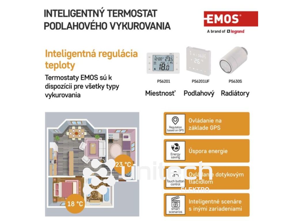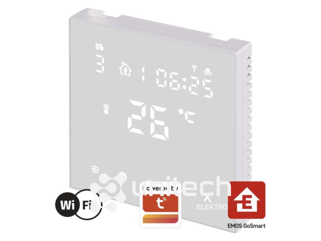 dĺžka kapilárneho čidla: neuvádza sa|dosah vo voľnom priestore: neuvádza sa|druh regulácie: vykurovací systém|farba: biela|funkcia ON/OFF: áno|funkcia prázdniny: áno|funkcia Set-back: nie|jazyky aplikácie: EN, CZ, SK, PL, DE, HU, SI, FR, + 60 ďalších jazykov|kalibrácia teploty: áno|kompatibilita: EMOS GoSmart, TUYA, LIDL, Smartlife, otvorený systém|meranie teploty: 0 °C až 95 °C, rozlišenie 0,5 °C|možnosť prepojenia s ďalšími detektormi: neuvádza sa|napájanie: 230 V AC|napájanie brány: neuvádza sa|napájanie prijímača: neuvádza sa|napájanie vysielača: neuvádza sa|nastavenie teploty: 1 °C až 70 °C, po 0,5 °C|nastaviteľný rozptyl teploty: vnútorné čidlo: 0,5 °C až 2,5 °C, rozlíšenie 0,5 °C; podlahové čidlo: 1 °C až 9 °C, rozlíšenie 1 °C|notifikácie do mobilnej aplikácie: áno|ochrana proti zamrznutiu: áno|ovládanie hlasovými asistentmi: áno (Amazon Alexa, Google Assistant)|počet programov: užívateľsky nastaviteľná teplota (6× za deň)|podlahový senzor: NTC 10 kΩ, 3 m|podporované OS: Android, iOS|podsvietený displej: áno|pracovná frekvencia: neuvádza sa|predajný obal: 1 ks, krabička|prenosová frekvencia: 2,4 GHz WIFI (IEEE802.11b/g/n)|protokol: Wi-Fi|rozmer: 86 × 86 × 43 mm|rozmer brány: neuvádza sa|rozmer prijímača: neuvádza sa|rozmer vysielača: neuvádza sa|spínaná záťaž: 16 A odporovo|spínanie: napäťové 230 V AC, 50 Hz|súčasť balenia: termostat, podlahové čidlo 3 m, Ø 8 mm|typ nastavenia teploty: 6 teplotných zmien denne|typ ovládania: programovateľný elektronický izbový termostat, možnosť ovládania cez mobil (iOS, Android)|typ termostatu: #Dodatočné parametre
