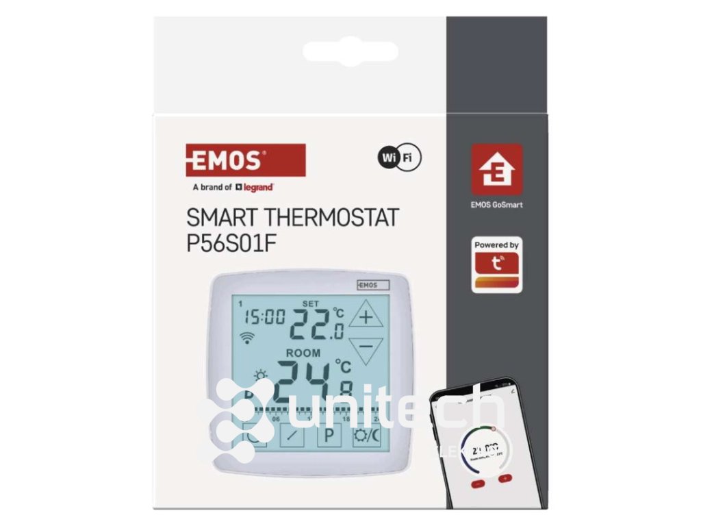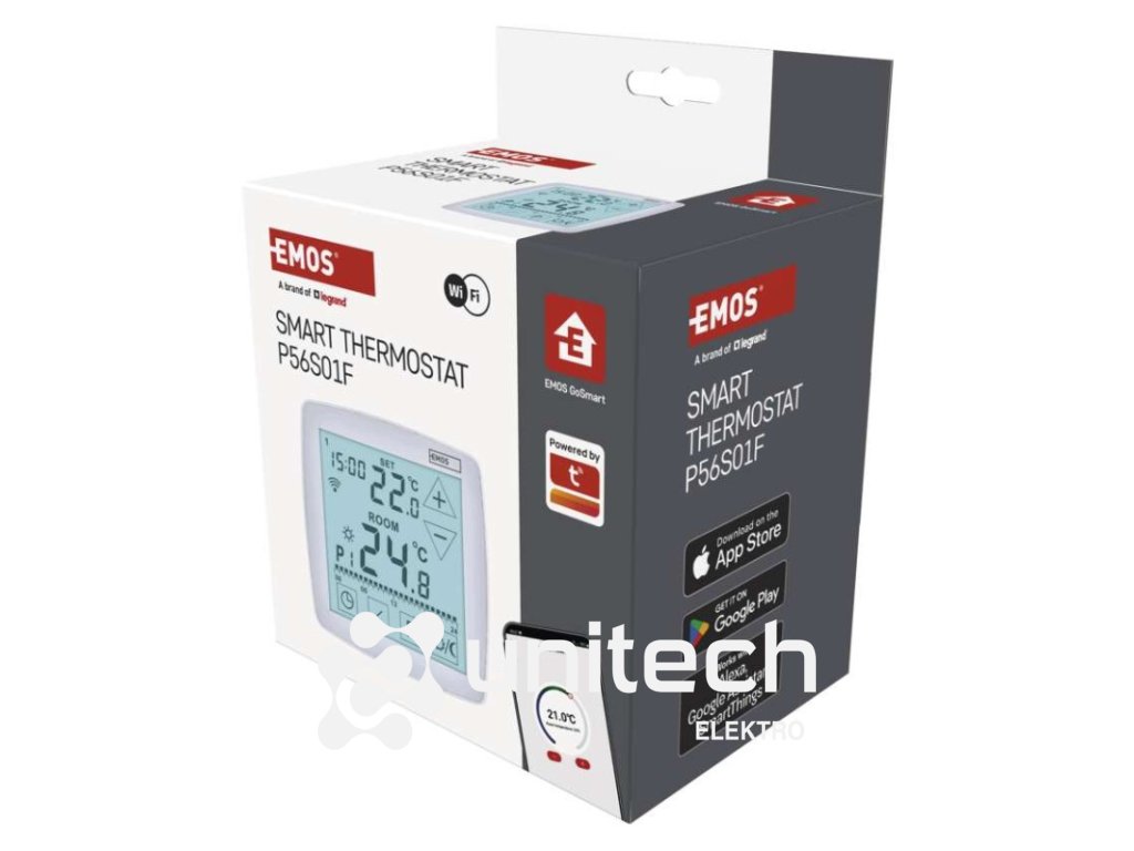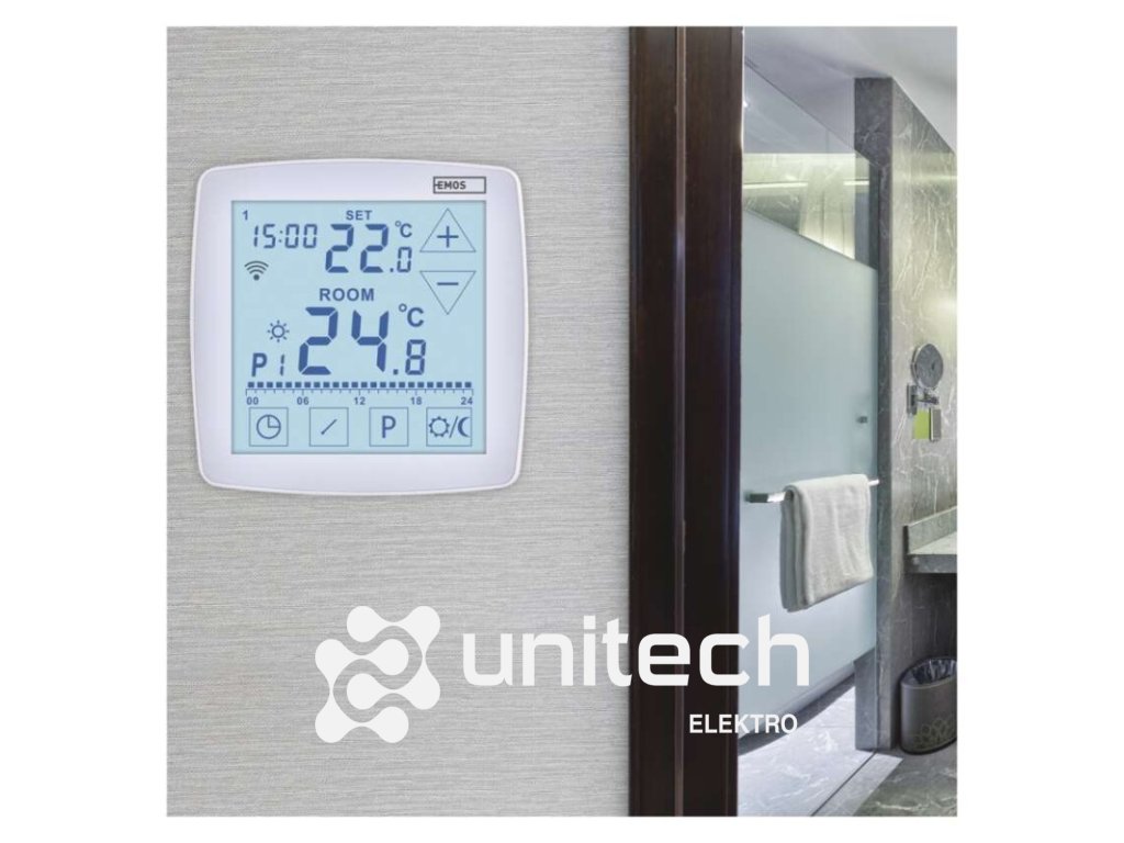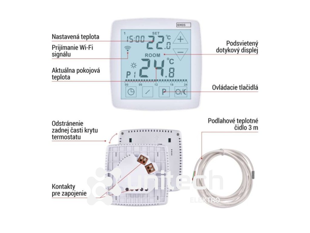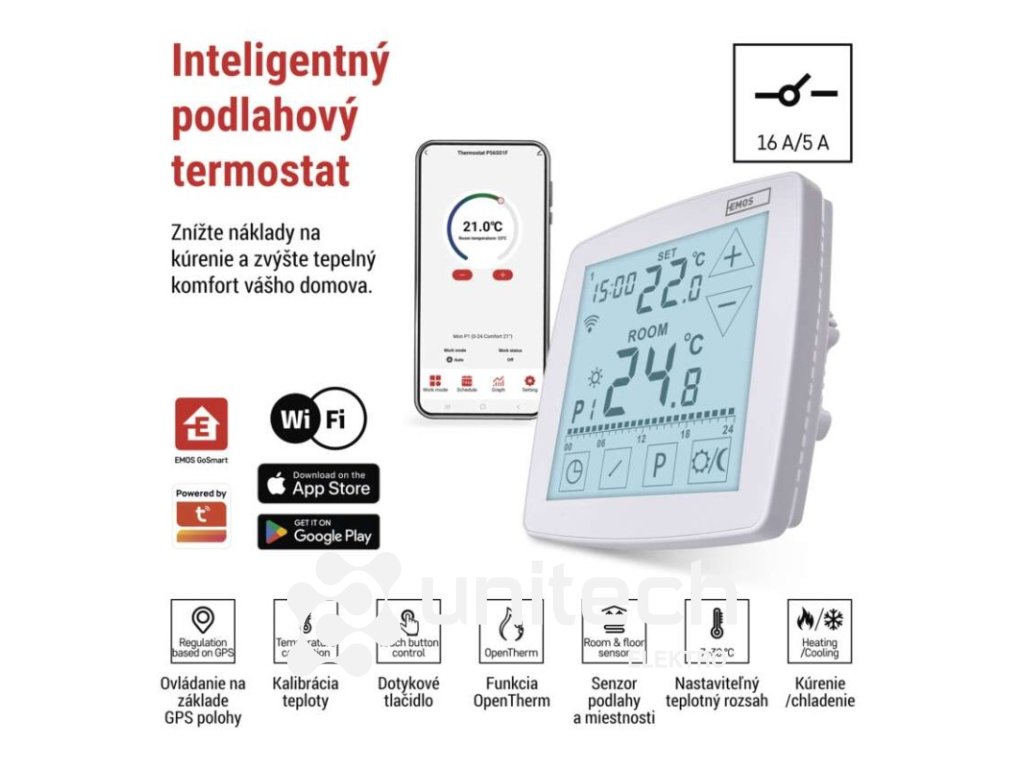 dĺžka kapilárneho čidla: –|dosah vo voľnom priestore: –|druh regulácie: vykurovací a chladiaci systém|farba: biela|funkcia ON/OFF: áno|funkcia prázdniny: áno|funkcia Set-back: nie|jazyky aplikácie: EN, CZ, SK, PL, DE, HU, SI, FR, + 60 ďalších jazykov|kalibrácia teploty: áno|kompatibilita: EMOS GoSmart, TUYA, LIDL, Smartlife, otvorený systém|meranie teploty: 0 °C až 40 °C, rozlíšenie 0,1 °C|možnosť prepojenia s ďalšími detektormi: nie|napájanie: 230 V AC|napájanie brány: –|napájanie prijímača: –|napájanie vysielača: –|nastavenie teploty: 7 ° C až 30 ° C, po 0,2 ° C|nastaviteľný rozptyl teploty: #|notifikácie do mobilnej aplikácie: áno|ochrana proti zamrznutiu: áno|ovládanie hlasovými asistentmi: áno (Amazon Alexa, Google Assistant)|počet programov: 6 + 3 užívateľsky nastaviteľné|podlahový senzor: NTC 10 kΩ, 3 m|podporované OS: Android, iOS|podsvietený displej: áno|pracovná frekvencia: –|predajný obal: 1 ks, krabička|prenosová frekvencia: 2,4 GHz WIFI (IEEE802.11b/g/n)|protokol: Wi-Fi|rozmer: 98 × 37 × 98 mm|rozmer brány: –|rozmer prijímača: –|rozmer vysielača: –|spínaná záťaž: 16 A odporovo, 5 A induktívne|spínanie: 230 V AC alebo beznapäťové|súčasť balenia: termostat, podlahové čidlo 3 m, Ø 8 mm|typ nastavenia teploty: komfortná a úsporná teplota|typ ovládania: programovateľný elektronický izbový termostat, možnosť ovládania cez mobil (iOS, Android)|typ termostatu: drôtový s OpenTherm komunikáciou + podlahové kúrenie, podomietkovýDodatočné parametre