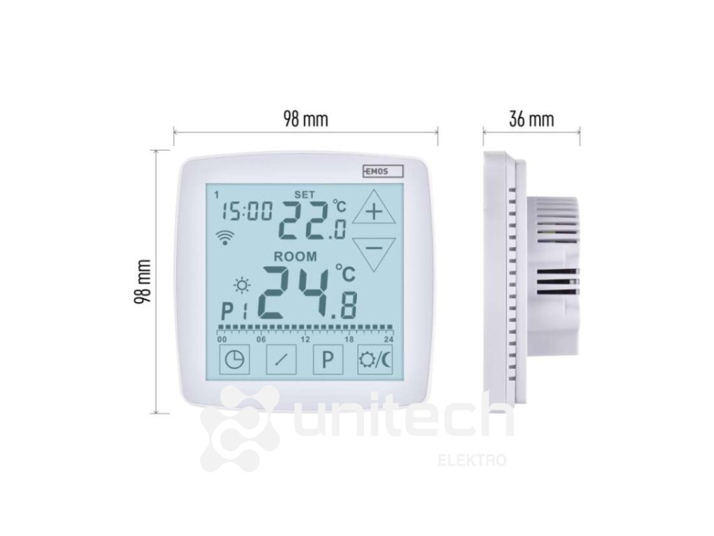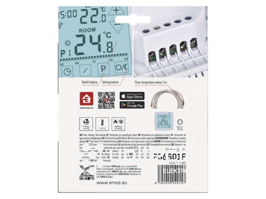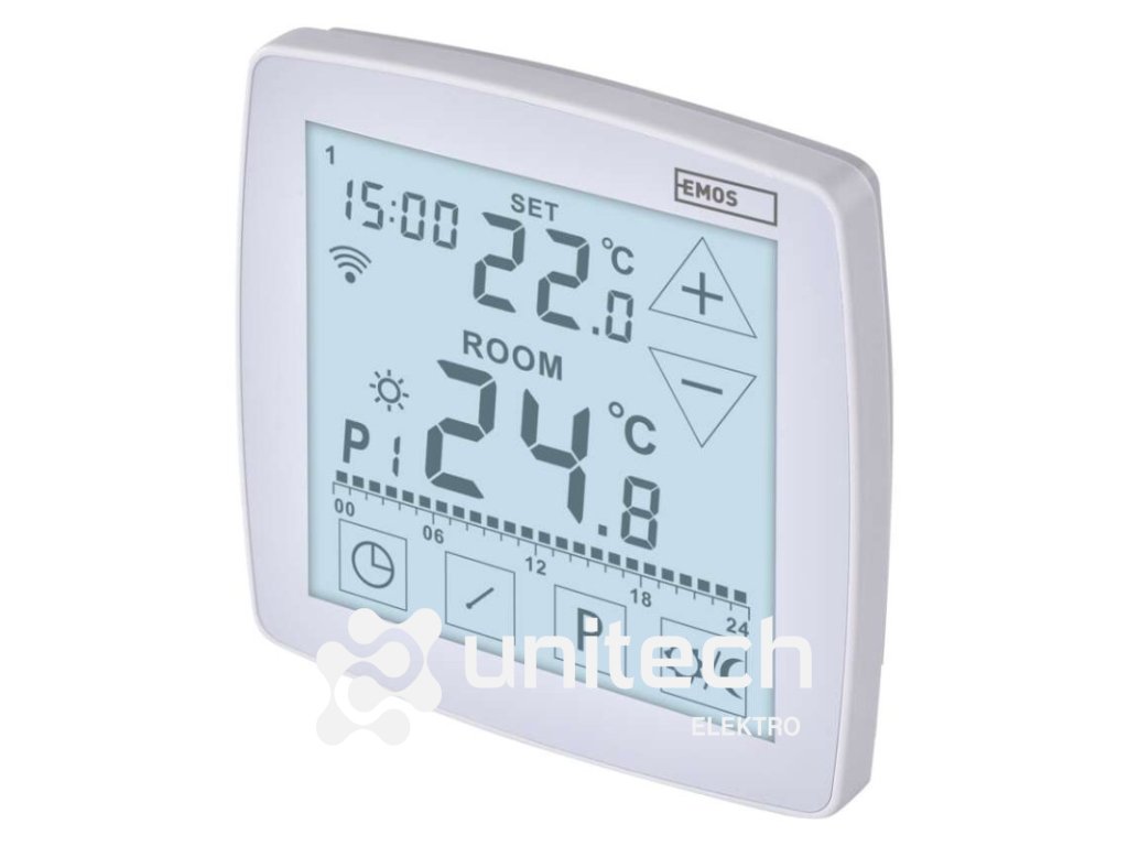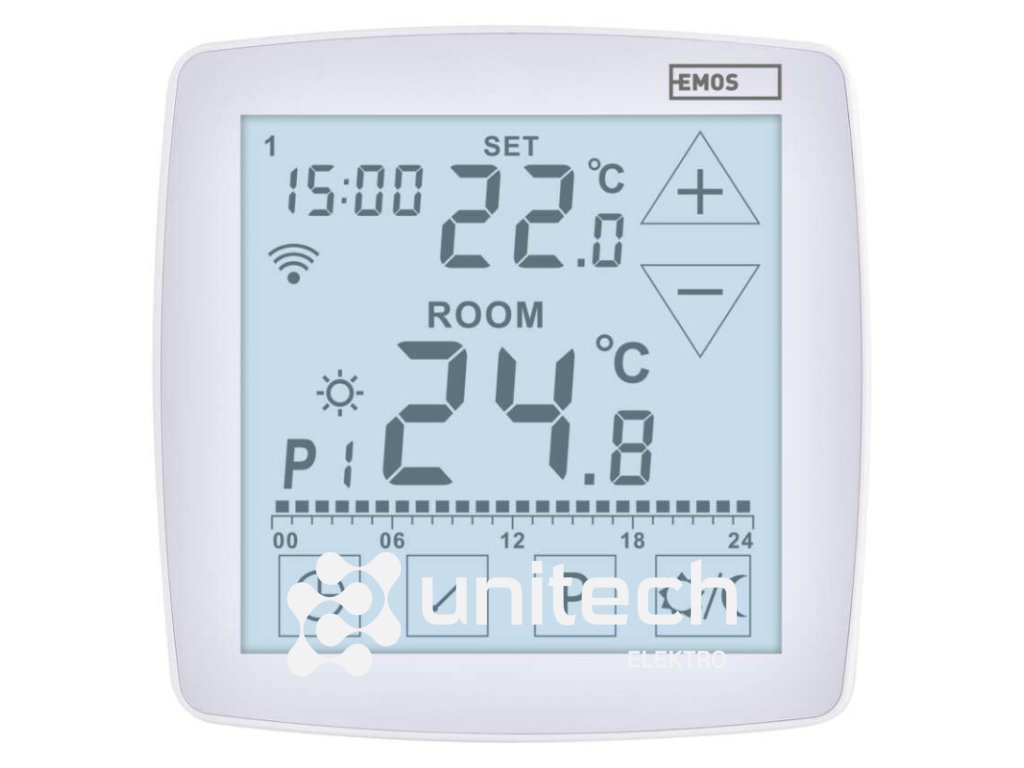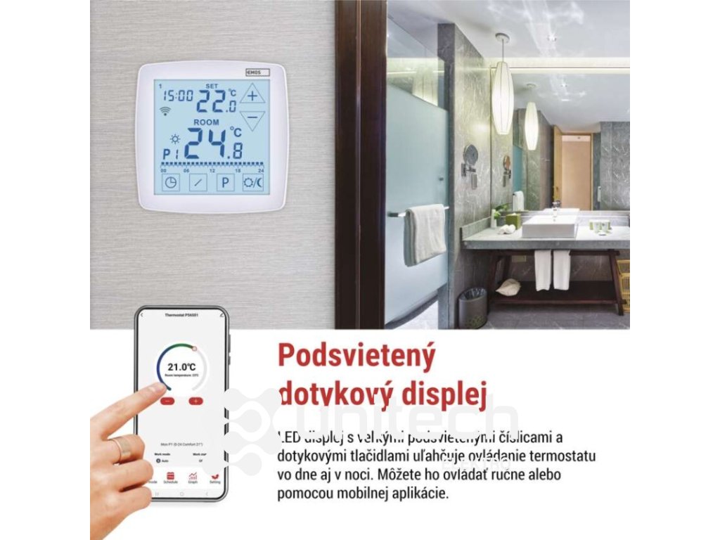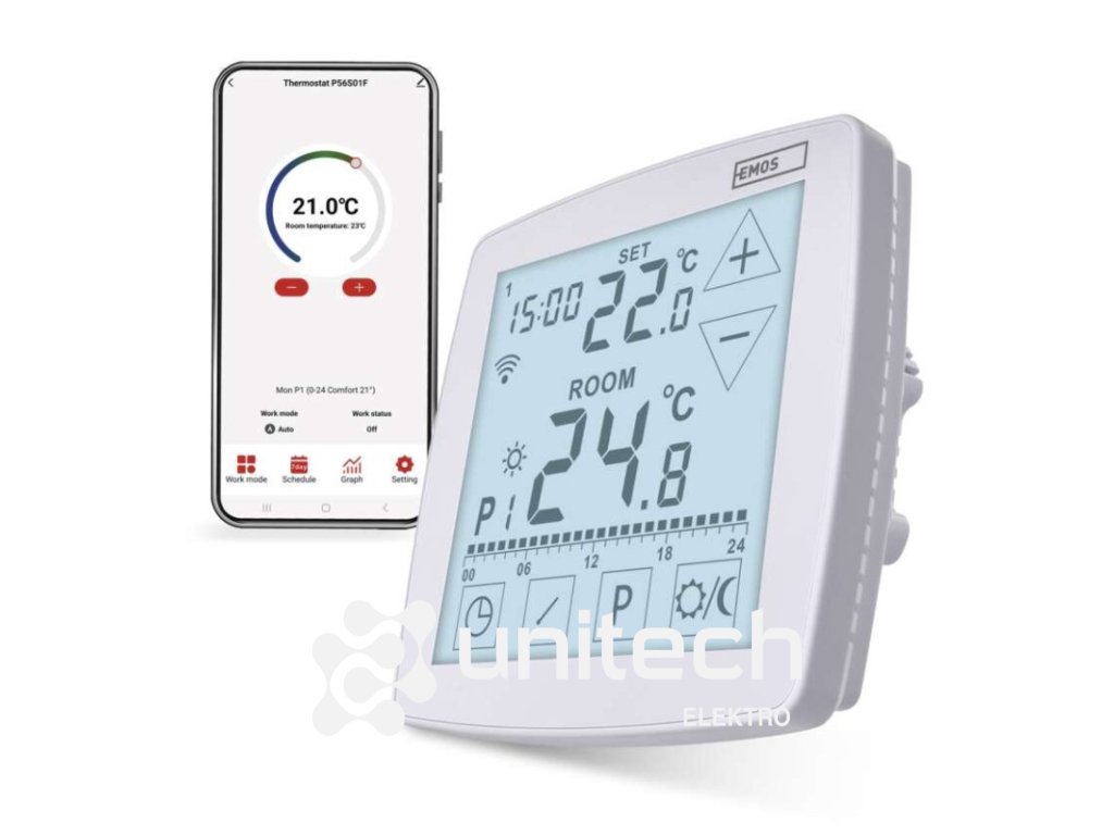 dĺžka kapilárneho čidla: –|dosah vo voľnom priestore: –|druh regulácie: vykurovací a chladiaci systém|farba: biela|funkcia ON/OFF: áno|funkcia prázdniny: áno|funkcia Set-back: nie|jazyky aplikácie: EN, CZ, SK, PL, DE, HU, SI, FR, + 60 ďalších jazykov|kalibrácia teploty: áno|kompatibilita: EMOS GoSmart, TUYA, LIDL, Smartlife, otvorený systém|meranie teploty: 0 °C až 40 °C, rozlíšenie 0,1 °C|možnosť prepojenia s ďalšími detektormi: nie|napájanie: 230 V AC|napájanie brány: –|napájanie prijímača: –|napájanie vysielača: –|nastavenie teploty: 7 ° C až 30 ° C, po 0,2 ° C|nastaviteľný rozptyl teploty: #|notifikácie do mobilnej aplikácie: áno|ochrana proti zamrznutiu: áno|ovládanie hlasovými asistentmi: áno (Amazon Alexa, Google Assistant)|počet programov: 6 + 3 užívateľsky nastaviteľné|podlahový senzor: NTC 10 kΩ, 3 m|podporované OS: Android, iOS|podsvietený displej: áno|pracovná frekvencia: –|predajný obal: 1 ks, krabička|prenosová frekvencia: 2,4 GHz WIFI (IEEE802.11b/g/n)|protokol: Wi-Fi|rozmer: 98 × 37 × 98 mm|rozmer brány: –|rozmer prijímača: –|rozmer vysielača: –|spínaná záťaž: 16 A odporovo, 5 A induktívne|spínanie: 230 V AC alebo beznapäťové|súčasť balenia: termostat, podlahové čidlo 3 m, Ø 8 mm|typ nastavenia teploty: komfortná a úsporná teplota|typ ovládania: programovateľný elektronický izbový termostat, možnosť ovládania cez mobil (iOS, Android)|typ termostatu: drôtový s OpenTherm komunikáciou + podlahové kúrenie, podomietkovýDodatočné parametre