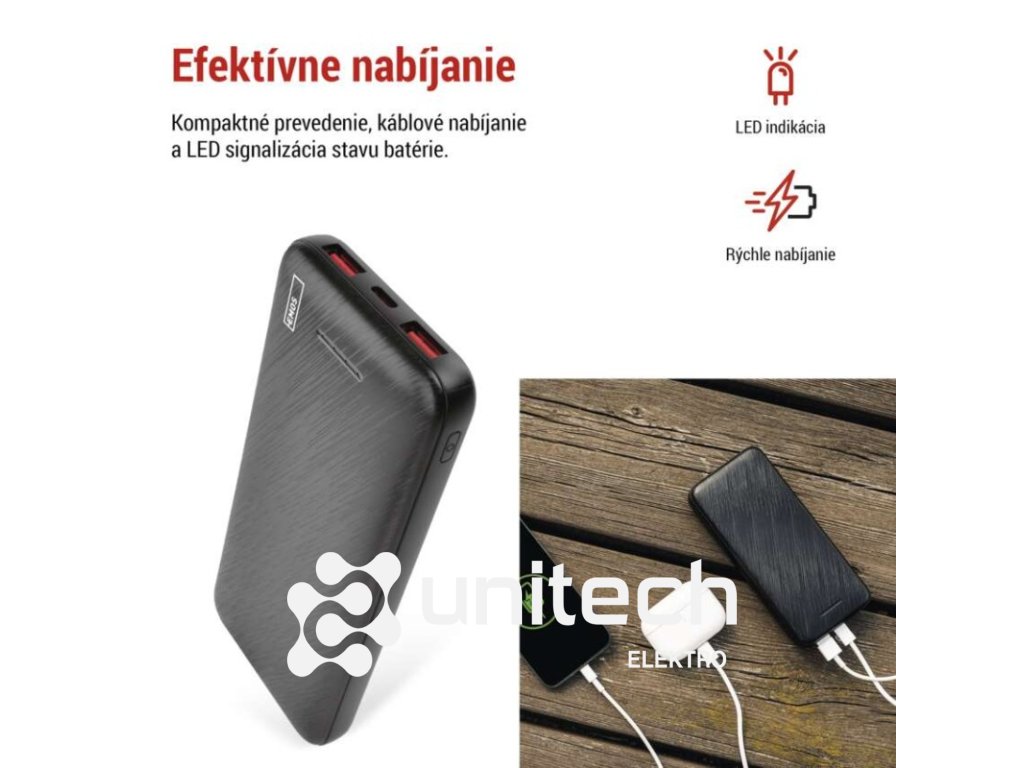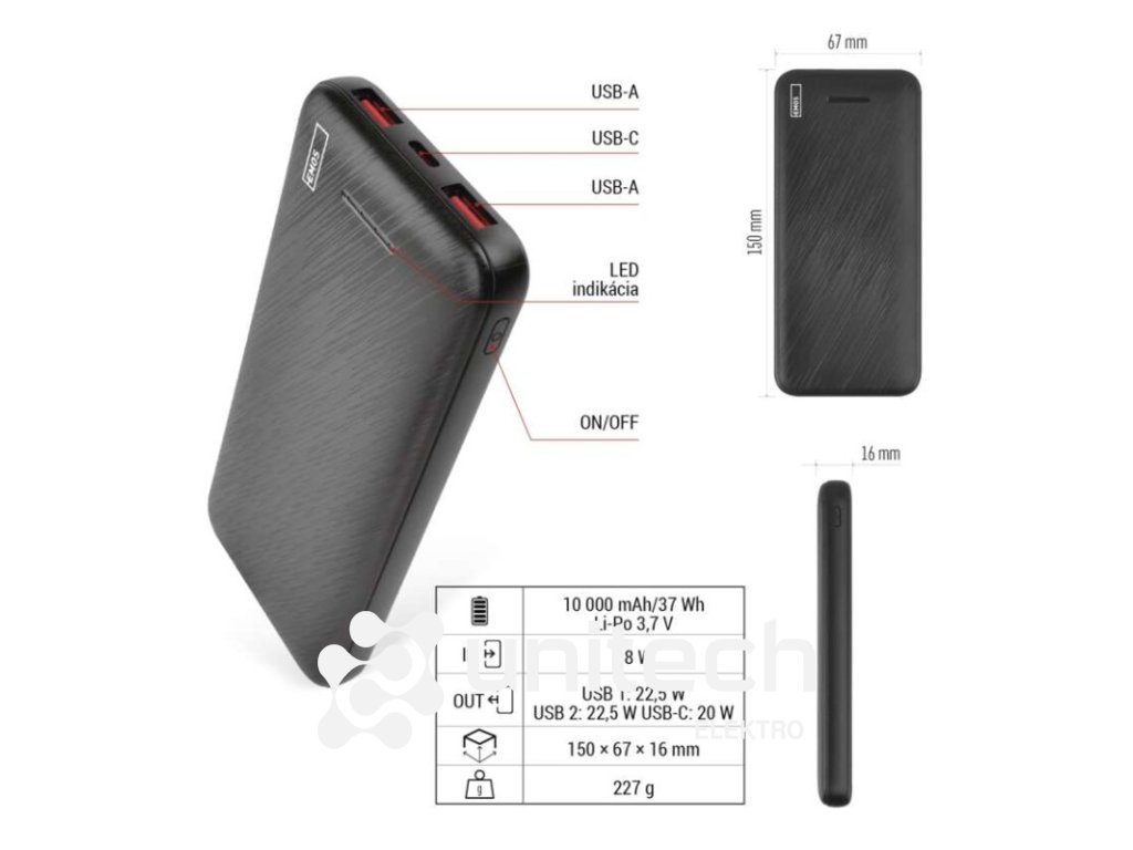 auto ON/OFF: áno|doba nabíjania: 3,5 hodiny|farba: čierna|hmotnosť: 227 g|kapacita akumulátora: 10 000 mAh/37 Wh|LED indikátor nabíjania: áno|LED indikátor stavu batérie: áno|materiál: ABS plast|max. vstupný výkon: 18 W|max. výstupný výkon: 22,5 W|ochrana proti podbitiu: áno|ochrana proti prebitiu: áno|ochrana proti preťaženiu: áno|ochrana proti skratu: áno|passthrough: áno|predajný obal: 1 ks, plastová krabička|prevádzková teplota: 0 °C až +40 °C|pribalený kábel: USB-A/USB-C|rozmer: 150 × 67 × 16 mm|rýchle nabíjanie: PD 20 W|typ akumulátora: Li-Po 3,7 V|typ vstupného rozhrania: 1× USB-C|typ výstupného rozhrania: 2× USB-A, 1× USB-C|záručná doba: 2 rokyDodatočné parametre