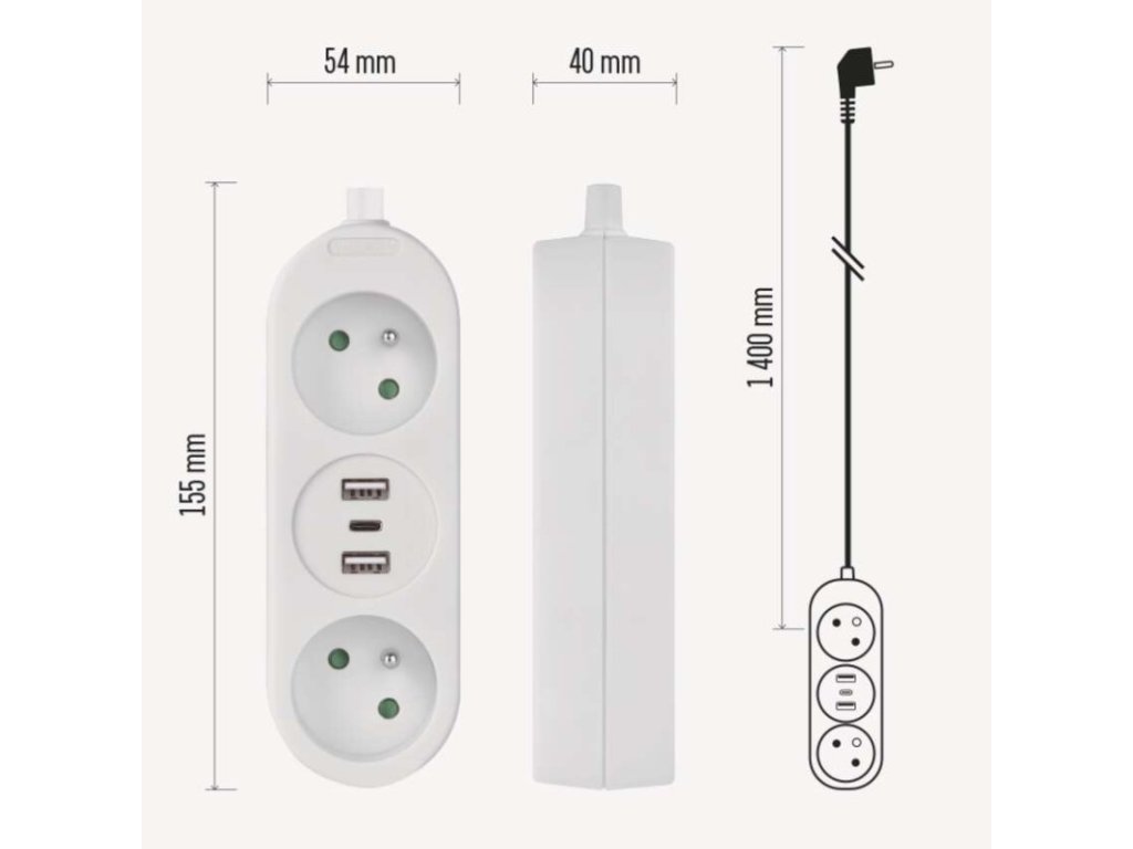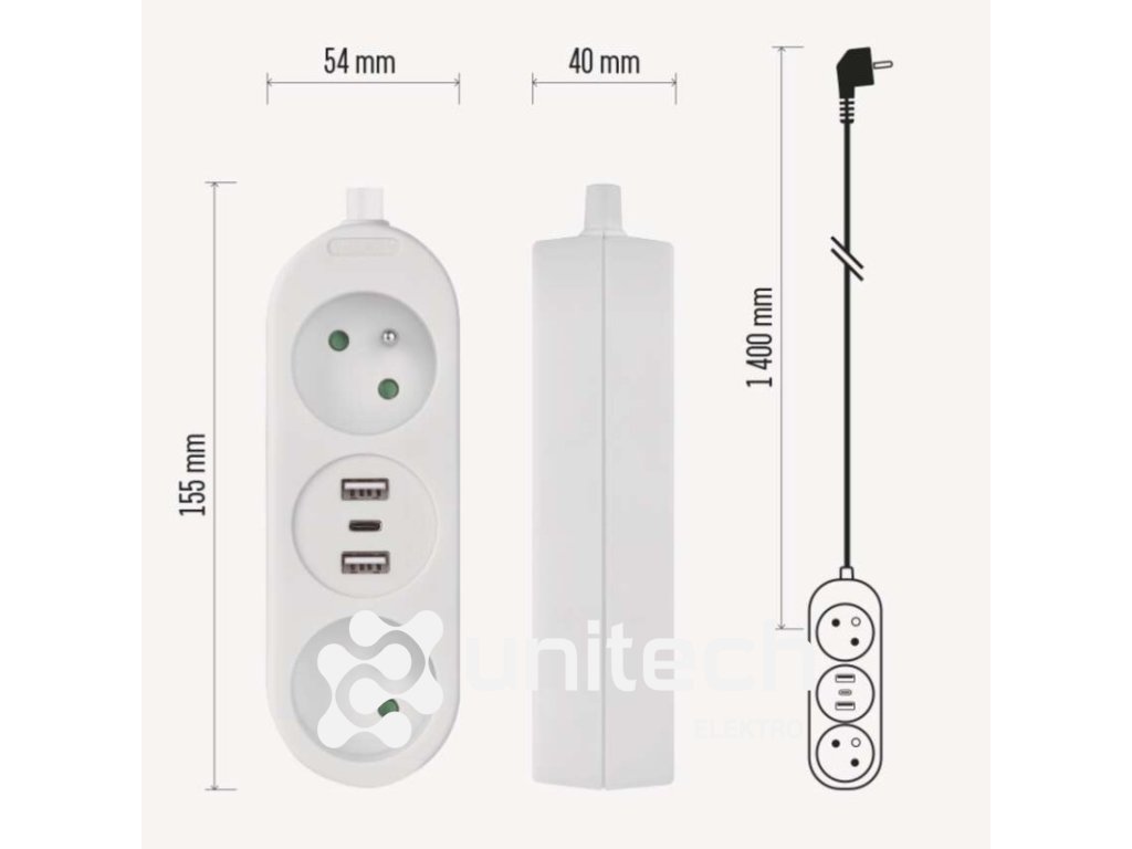 ďalšie funkcie: nie|detské clonky: áno|dĺžka: 1,4 m|farba: biela|jazyky aplikácie: –|kompatibilita: –|krytie: IP20|materiál zásuvky a vidlice: plast|max. záťaž: 3 680 W|napätie: 230 V|notifikácie do mobilnej aplikácie: nie|ovládanie hlasovými asistentmi: nie|počet zásuviek: 2× 2P + PE|podporované OS: –|predajný obal: 1 ks, záves|prenosová frekvencia: –|prierez vodiča: 1,5 mm²|protokol: –|prúd: 16 A max.|typ izolácie: PVC|USB výstup: 2× USB typ A + 1× USB typ C ; 5 V DC; total ∑ 3,4 A (17 W) max.|vodič: H05VV-F3G 1,5 mm²|vypínač: nieDodatočné parametre