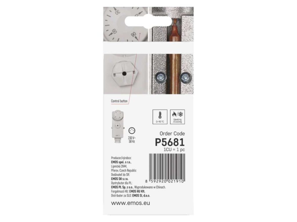 dĺžka kapilárneho čidla: neuvádza sa|dosah vo voľnom priestore: neuvádza sa|druh regulácie: vykurovací a chladiaci systém|farba: biela|funkcia ON/OFF: nie|funkcia prázdniny: nie|funkcia Set-back: neuvádza sa|kalibrácia teploty: nie|meranie teploty: 0 °C až 90 °C|možnosť prepojenia s ďalšími detektormi: neuvádza sa|napájanie: 230 V, 400 V AC|napájanie brány: neuvádza sa|napájanie prijímača: neuvádza sa|napájanie vysielača: neuvádza sa|nastavenie teploty: 0 °C do 90 °C, rozlíšenie 5 °C|nastaviteľný rozptyl teploty: neuvádza sa|ochrana proti zamrznutiu: nie|počet programov: neuvádza sa|podsvietený displej: neuvádza sa|pracovná frekvencia: neuvádza sa|predajný obal: 1 ks, krabička|protokol: –|rozmer: 38 × 54 × 105 mm|rozmer brány: neuvádza sa|rozmer prijímača: neuvádza sa|rozmer vysielača: neuvádza sa|spínaná záťaž: 16 A odporovo, 4 A induktívne|spínanie: napäťové 230 V AC, 50 Hz|súčasť balenia: neuvádza sa|typ nastavenia teploty: neuvádza sa|typ ovládania: manuálny termostat|typ termostatu: drôtový príložnýDodatočné parametre