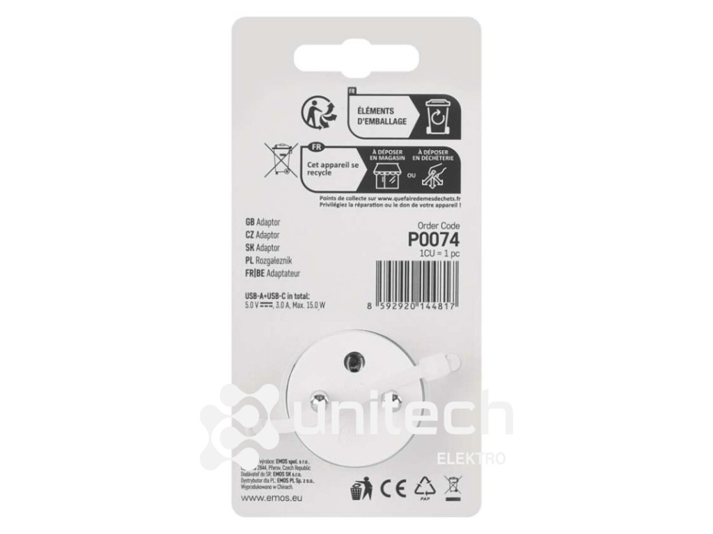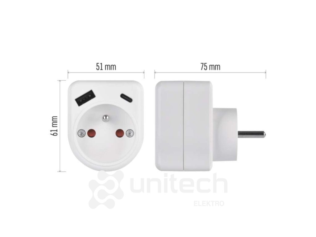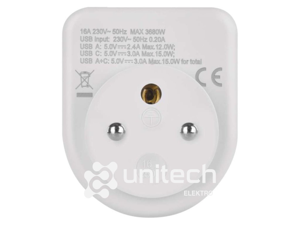 | produkt: | rozbočovacia zásuvka 1× + 1× USB-A 5 V DC/2,4 A/ 12 W + 1× USB-C 5 V DC/ 3 A/ 15 W, Total A+C: 3 A/ 15 W max. |