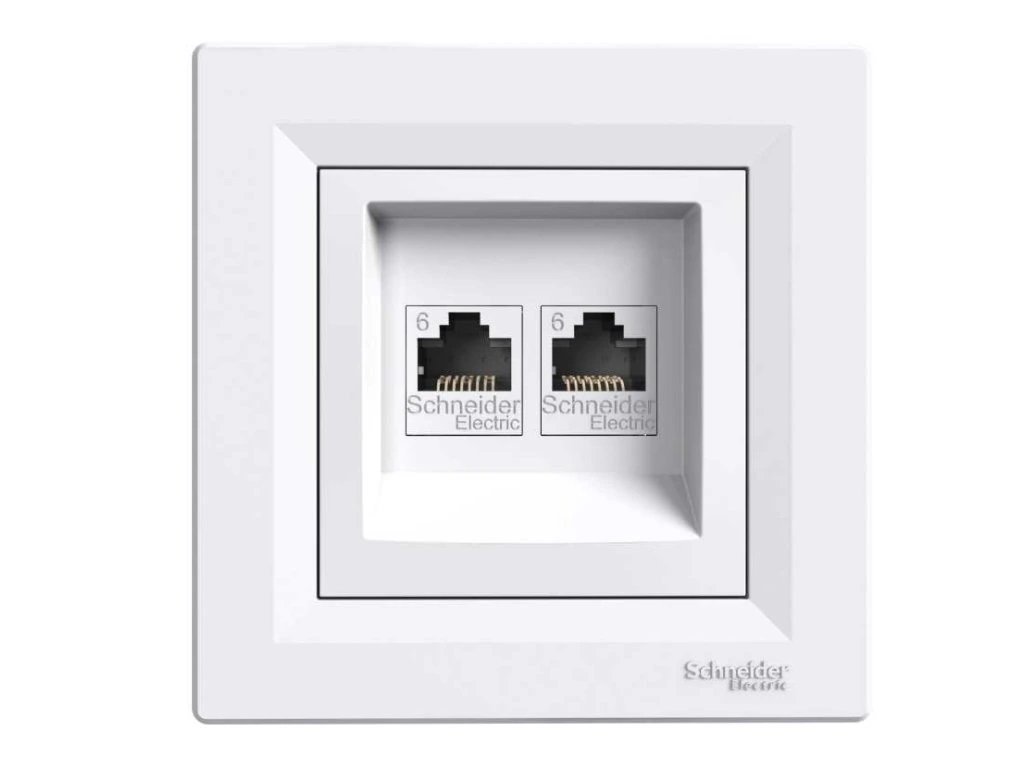 Dvojitá dátová zásuvka 2×RJ45 kat.6 UTP série Schneider Electric ASFORA v bielom prevedení. Mechanizmus určený do rámčekov série ASFORA, vhodný pre gigabitové siete a moderné dátové rozvody.